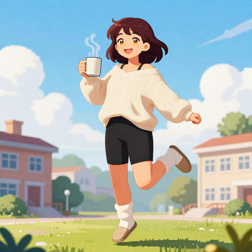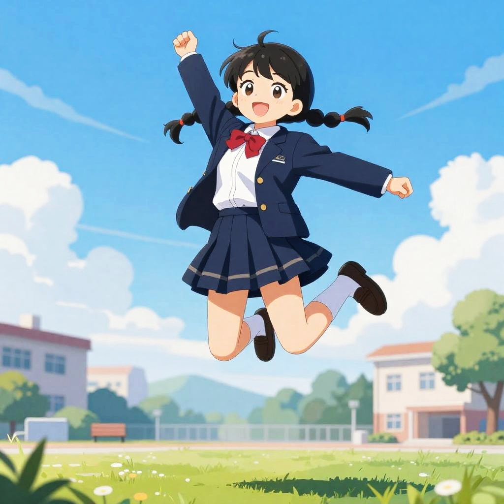 Illustration of a cheerful young schoolgirl with jet-black braided hair, brown eyes, and round glasses. She wears a navy blazer, white blouse, red ribbon tie, pleated grey skirt, knee-high navy socks, and brown loafers, carrying a dark satchel. The girl is captured mid-jump in a vibrant outdoor setting with green grass, blue sky, fluffy clouds, and buildings in the background. The composition features dynamic angle and perspective with bright ambient and accent lighting.