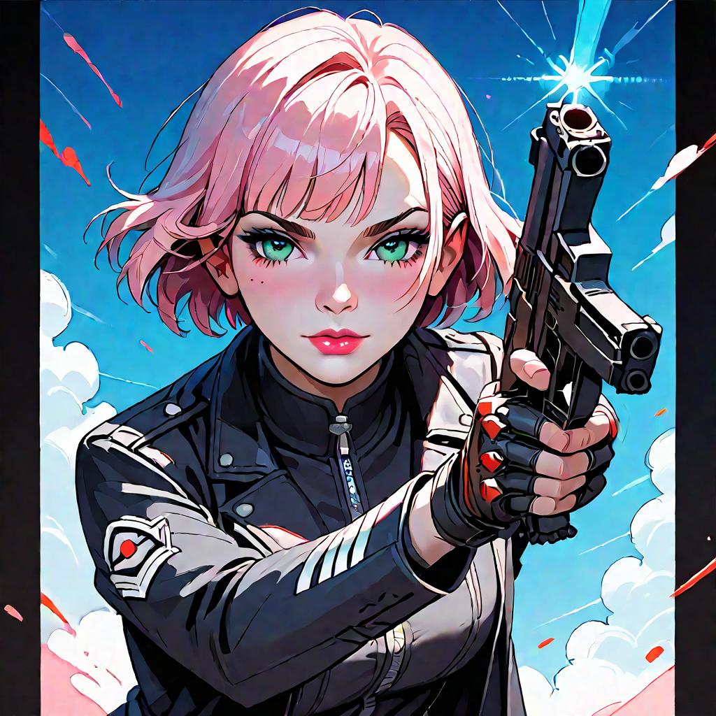 Score_9, score_8_up, score_7_up, score_6_up, score_5_up, score_4_up, source_anime, screenshots, holding gun, handgun, aiming, dominator \(gun\)tsunemori, blue jacketkunizuka, black coat