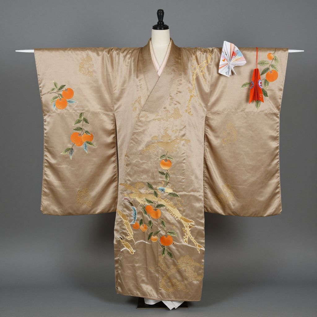Photograph of a gold satin kimono with vibrant orange and green floral embroidery, and a red tassel attached, displayed on a black mannequin