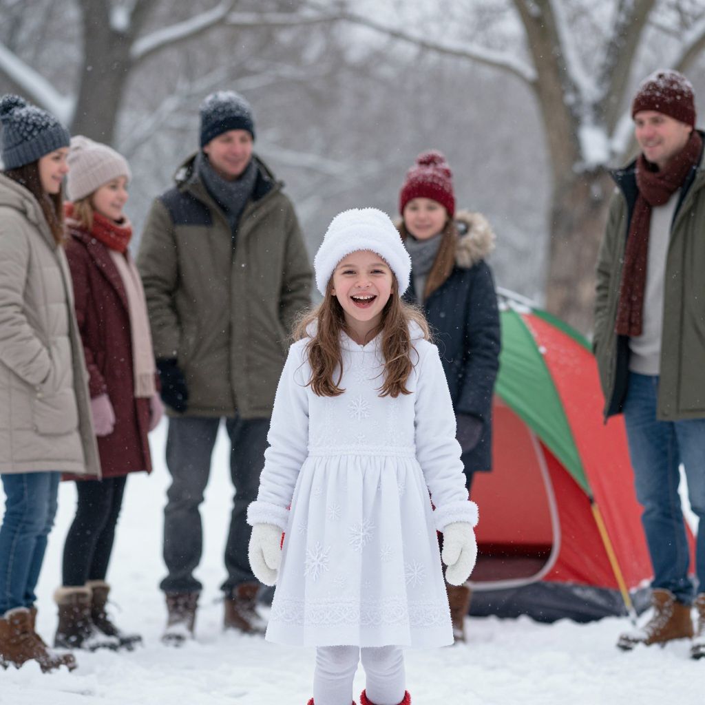 A realistic, cinematic shot of a family group in a snowy park, with a girl around 10 years old in a white Christmas costume — a white snowflake-patterned dress and matching mittens — laughing while snowflakes fall around her, with a cozy red and green tent in the background.