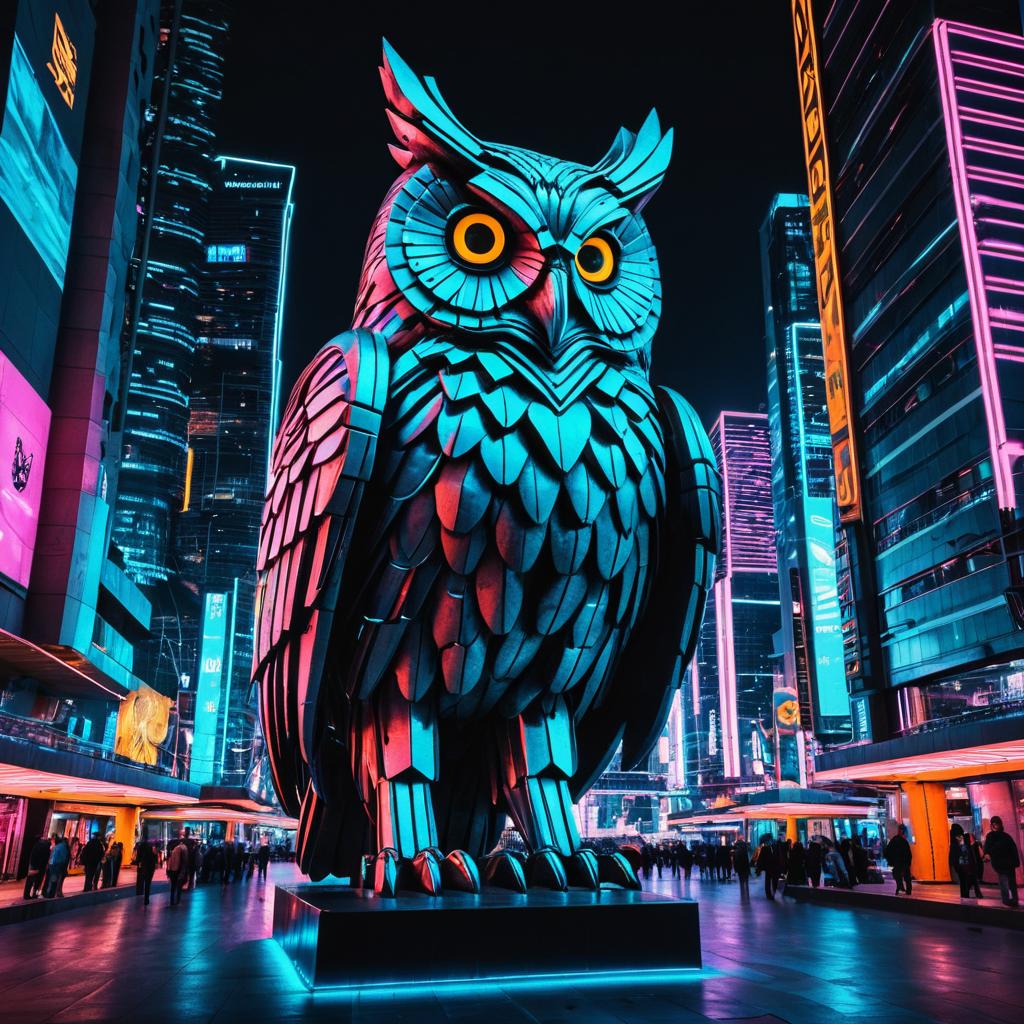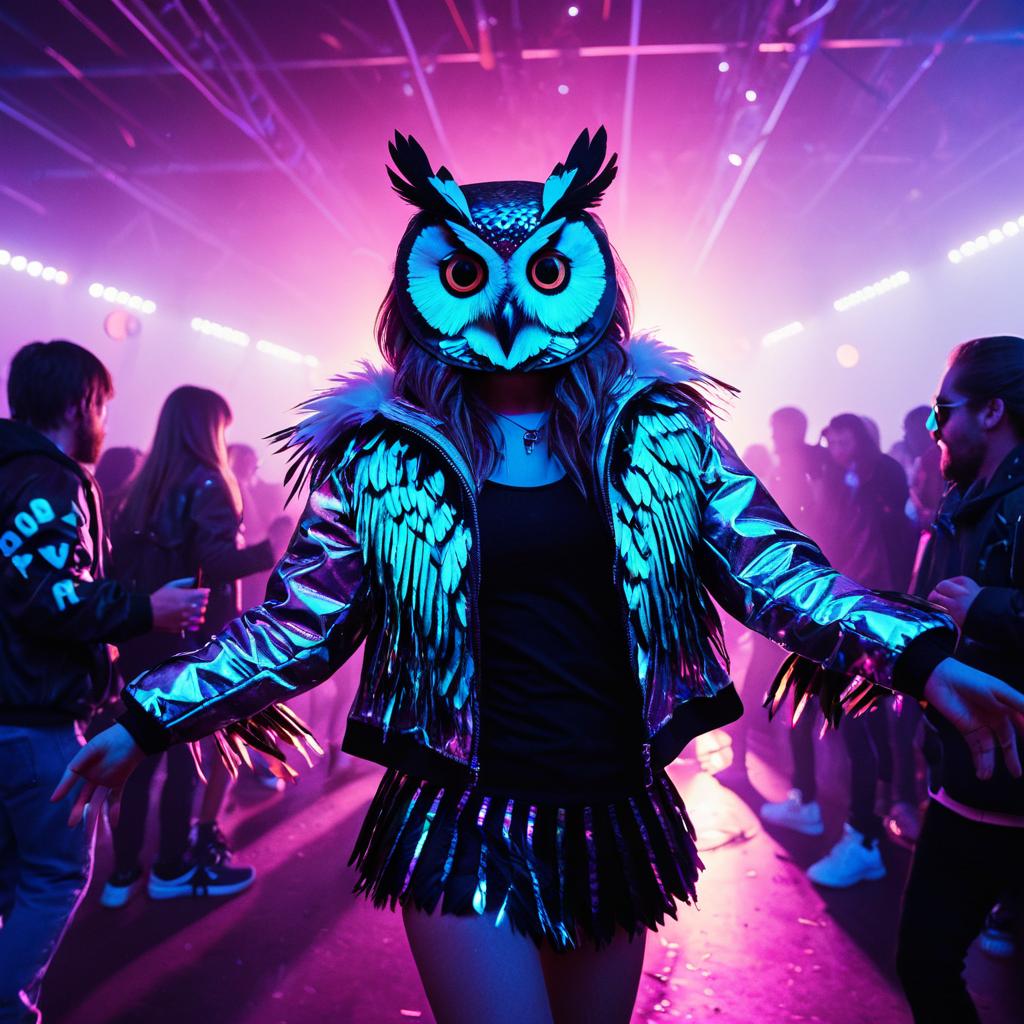 Whimsical owl wearing plaid scarf dancing at a rave party, dvr-lthr, neonpunk, lofi, npai, blacklight, PENeonUV, volumetric lighting, fog, backlit, pastel neon hues
