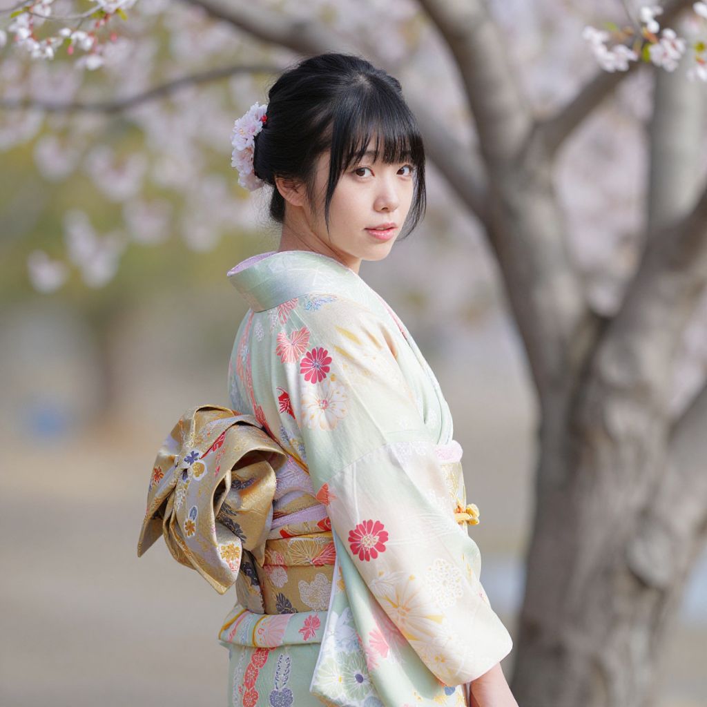 Photograph of a young Japanese woman standing outdoors during cherry blossom season. She has fair skin, black hair styled in a traditional updo with a pink floral hairpin, and is wearing a white kimono adorned with pink and red floral patterns. A beige obi with intricate designs is tied at her back. She looks over her shoulder with a gentle expression. In the blurred background, a large tree with pink cherry blossoms is visible. The image has a soft, natural light that highlights the delicate textures of the kimono and cherry blossoms.