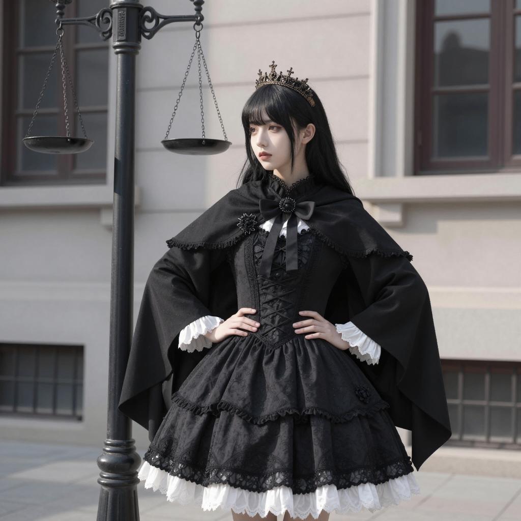 Young woman with pale skin and long black hair dressed in a detailed black gothic dress with white lace trim and a matching black cape adorned with floral brooches. She wears a decorative crown and stands confidently outdoors near a black lamppost that features hanging scales, with a stone building and windows in the background. Her hands are on her hips as she looks to the side under natural sunlight.