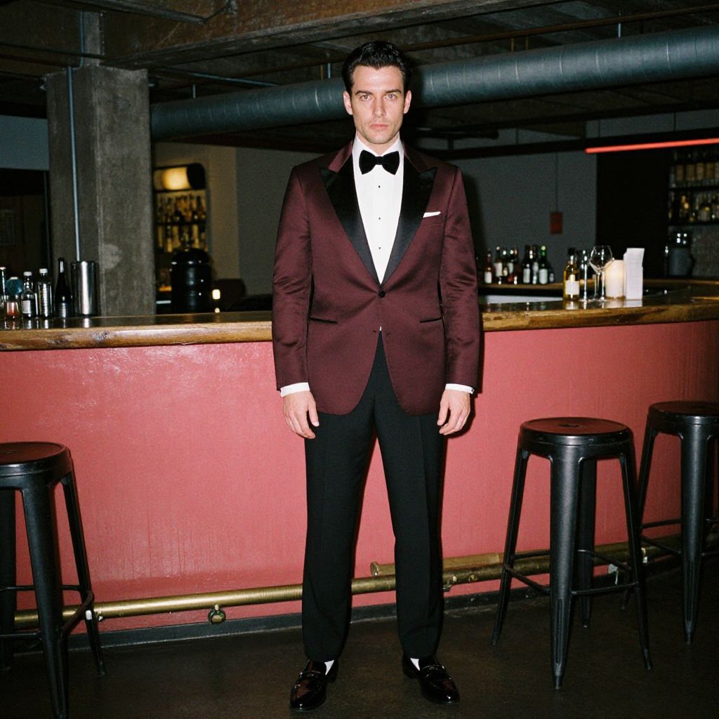 A man, burgundy silk blend tuxedo, black satin notch lapels, white poplin dress shirt, black velvet bow tie, tailored black trousers, shiny black loafers, industrial chic space, exposed beams and pipes, vibrant cocktail bar, cri film style, confident expression. Man has masculine face and piercing eyes