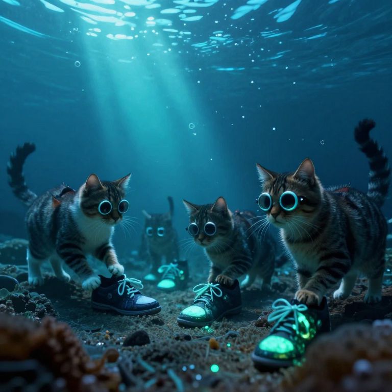 Photograph of underwater scene with four alert tabby kittens wearing glowing blue-rimmed glasses and neon sneakers, surrounded by rocks and illuminated bubbles, bath