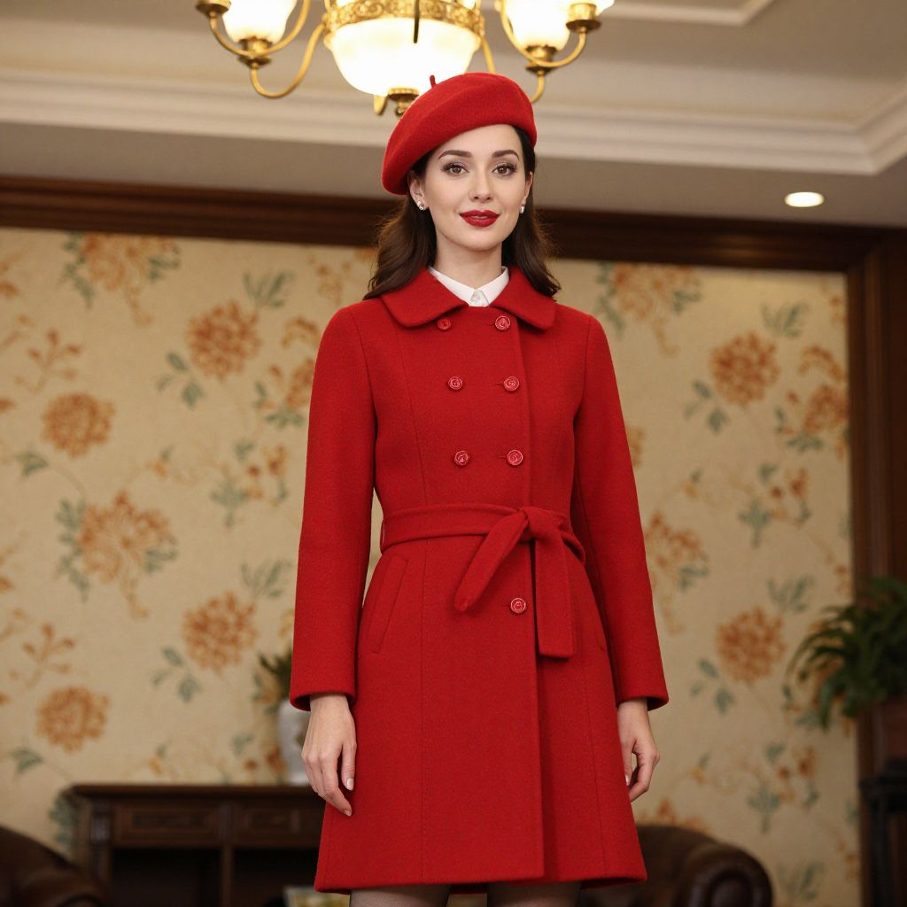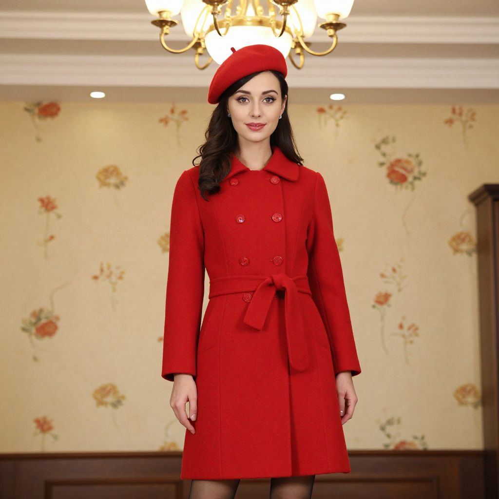 Elegantly styled woman wearing a vibrant red beret and matching coat stands in a warmly lit room, her polished appearance complemented by a chandelier above and floral-patterned wallpaper behind her.