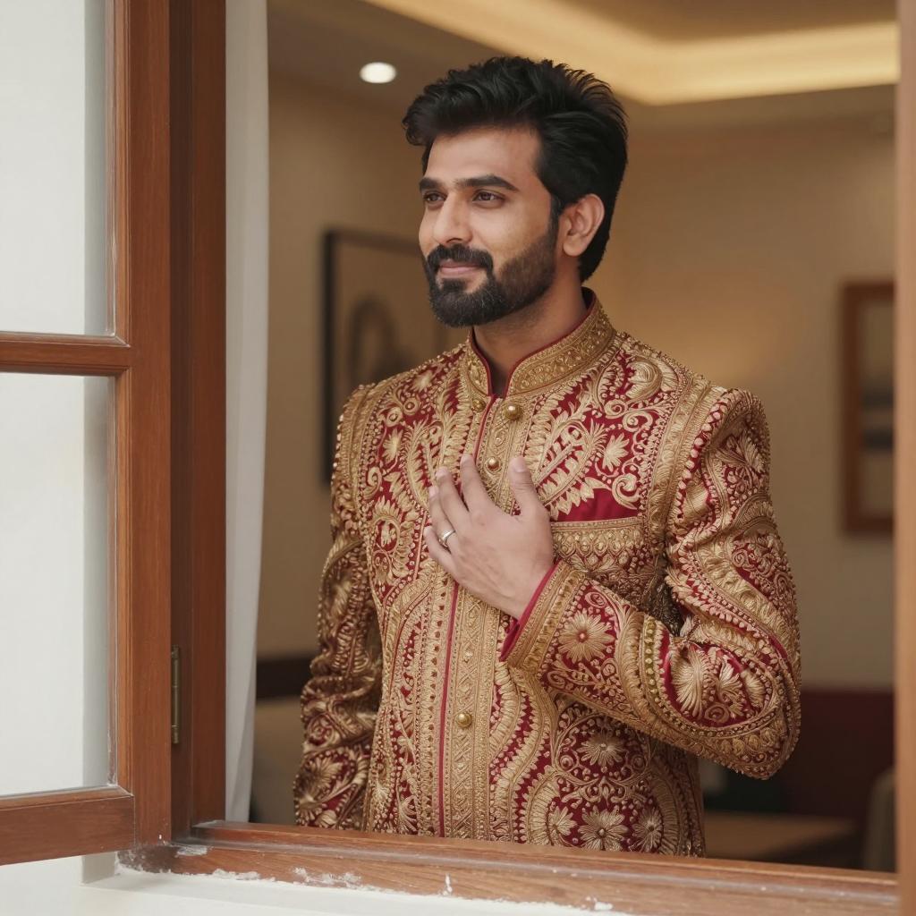 Portrait of a man with short dark hair and trimmed beard wearing a red and gold ornate traditional Indian sherwani. The man stands indoors by a brown wooden window frame with natural light illuminating his face. He gently touches his chest with one hand, smiling subtly. The background shows a modern interior with warm lighting and soft focus.
