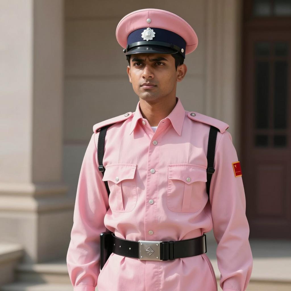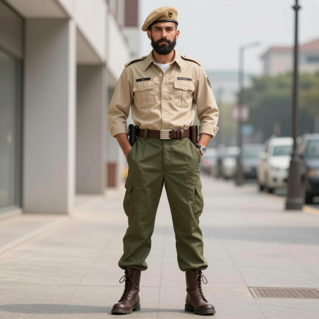Military pants man costume, photograph of a bearded man standing outdoors, wearing a military-style uniform with olive green pants, brown belt, and brown boots, beige shirt with shoulder patches and name tag, tan beret, hands in pockets, daytime, street setting, concrete building on left, blurred background, soft sunlight, realistic, portrait orientation, slight shadow on the ground