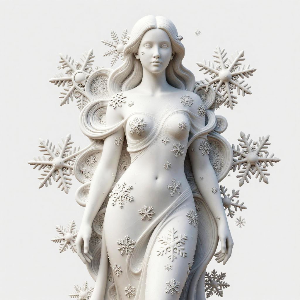 Digital sculpture of a nude, silver-haired woman with intricate snowflake patterns on her body, surrounded by large snowflakes, against a white background.