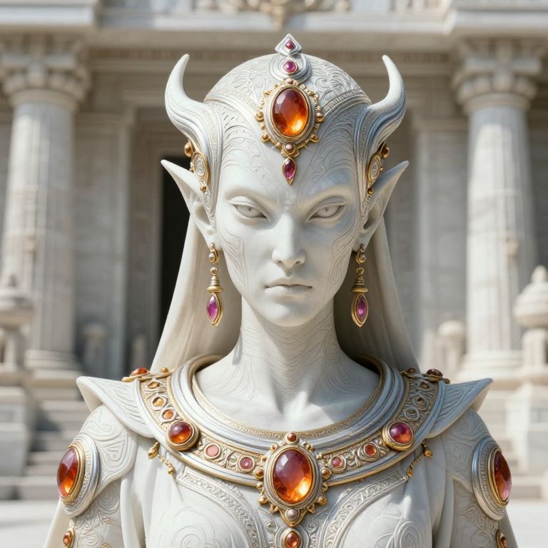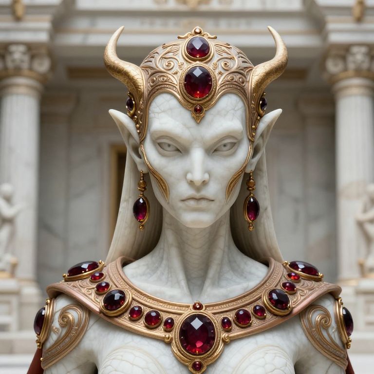 This is a digital CGI image of a statuesque, white-skinned, elven-like figure with pointed ears and piercing eyes, adorned with an ornate, gold crown featuring large, red gemstones. The figure's hair is long and flows down its back. It wears an elaborate, gold necklace also studded with large, red gemstones. The background is a blurred, classical architectural setting with marble columns. The figure's expression is stern and imposing, with a high level of detail in the textures of the skin, gems, and gold. The image has a realistic yet fantastical style, emphasizing the otherworldly nature of the figure.