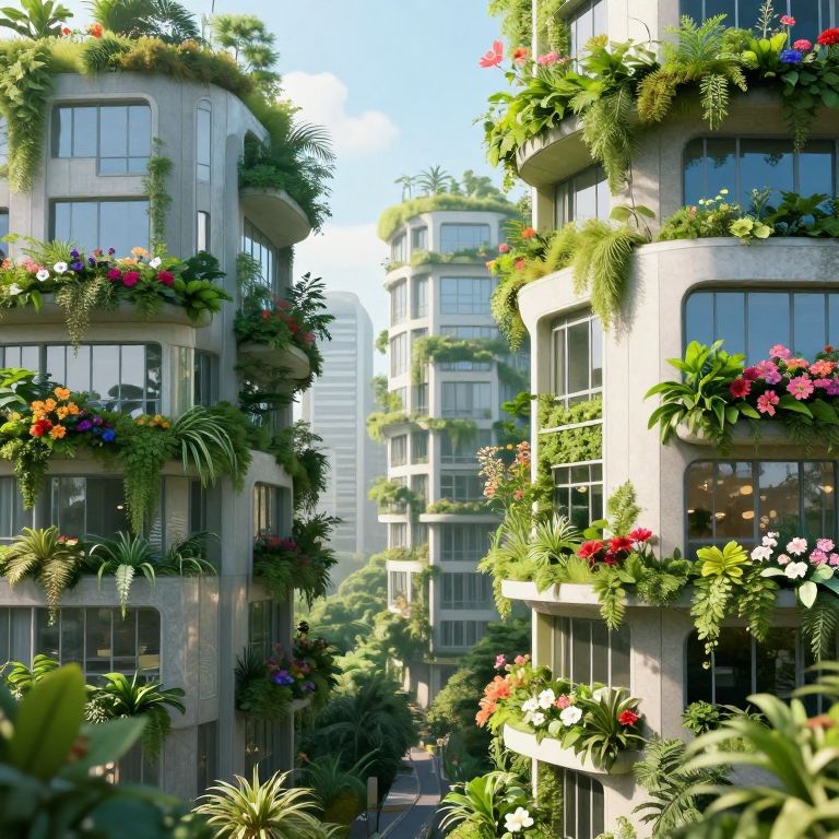 A vibrant digital rendering depicts a futuristic cityscape where buildings seamlessly integrate with nature, their windows adorned with lush greenery and colorful blooms that open like eyes during the day, creating a serene and harmonious environment bathed in soft, natural light.