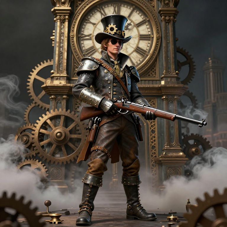 Steampunk character design showcasing a noble explorer adorned with metallic epaulettes, a cog-laden top hat, and riveted boots, holding a steam-powered rifle, standing in front of a giant clock tower surrounded by gears and steam clouds, richly textured and moody atmosphere.