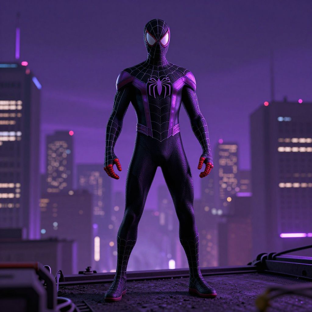 Black and purple Spider Man standing heroically atop a neon-lit bridge at dusk, cityscape glowing with purple and black hues in the background, futuristic cyberpunk atmosphere, highly detailed suit reflecting ambient light with a mix of matte and glossy textures