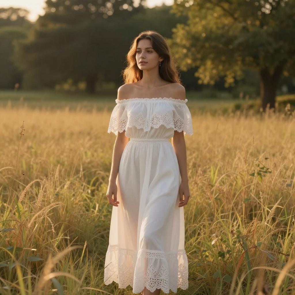 Photograph of a young woman standing in a golden grassy field during sunset. She has long brown hair, light skin, and is wearing an off-the-shoulder, white, lace-trimmed dress that flows to the ground. Her earrings are visible, and she's looking slightly to the side. The background has lush green trees, and the sunlight creates a warm, glowing effect on her and the grass.