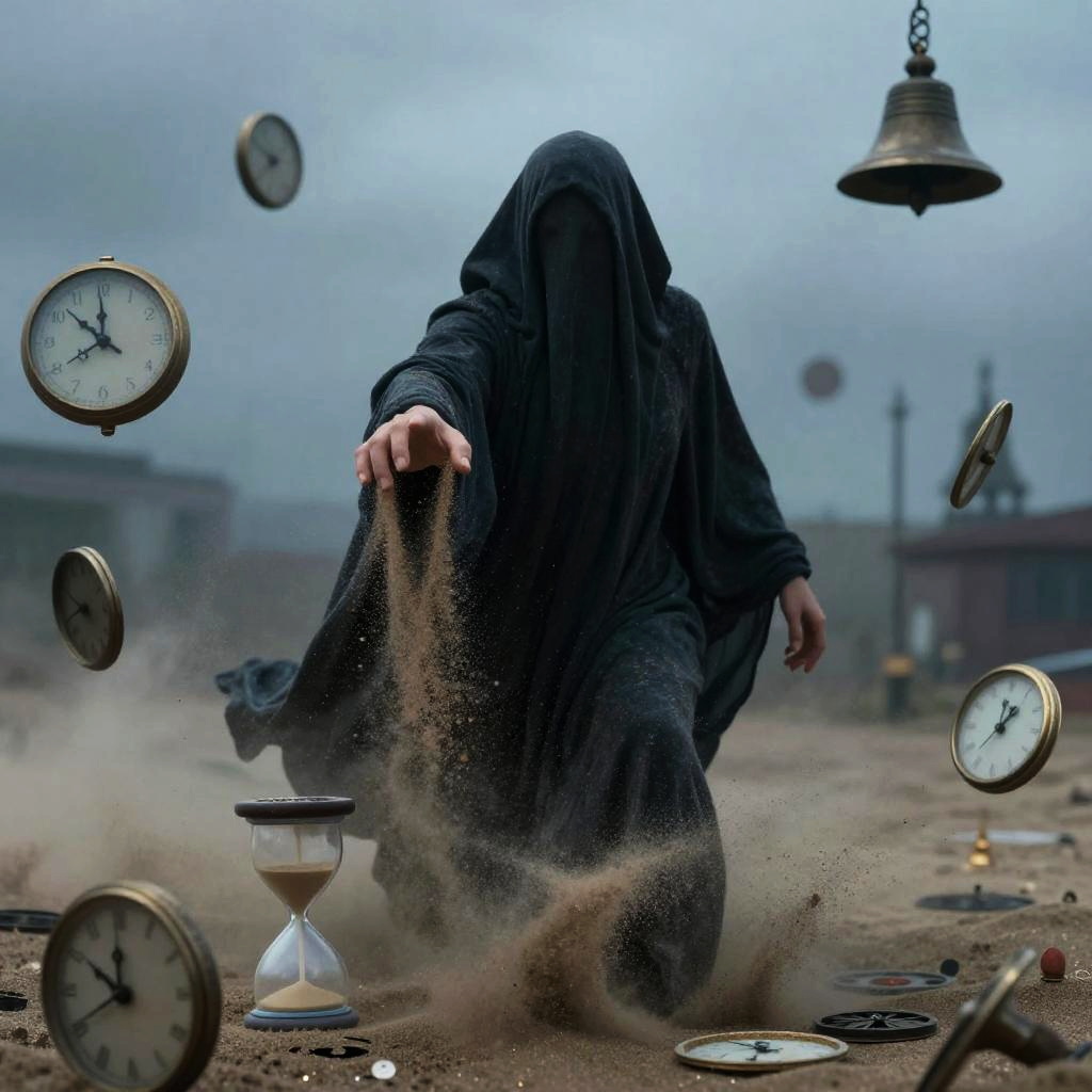 A dark, ghostly figure cloaked in black is seen leaking fine, luminous sand from its hands over a glowing hourglass. Surrounding it are floating, fractured clock faces and clock hands in a misty, dusk setting, symbolizing the passage and manipulation of time.