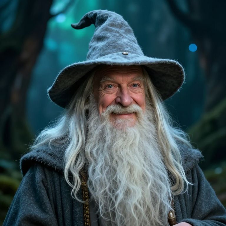 Gandalf smile, a wise old wizard with a long white beard and pointed hat, his face radiating warmth and kindness as he smiles softly against a mystical forest backdrop, intricate details, fantasy art style, vibrant colors, magical atmosphere.