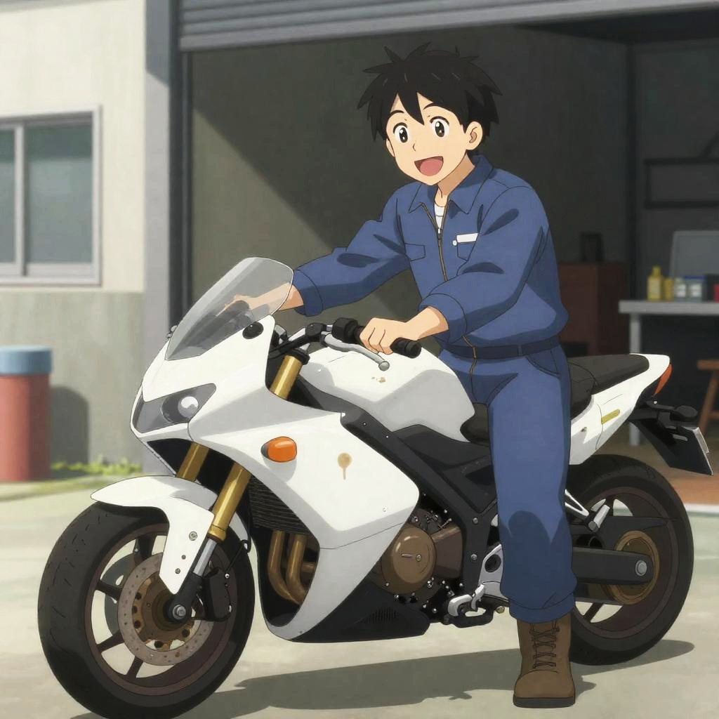 Realistic photo.a cheerful mechanic, wearing a casual jumpsuit with oil stains, working on a futuristic motorcycle, in a sunny outdoor workshop, depicted in the detailed and lighthearted anime style of Kosuke Fujishima. realistic photo