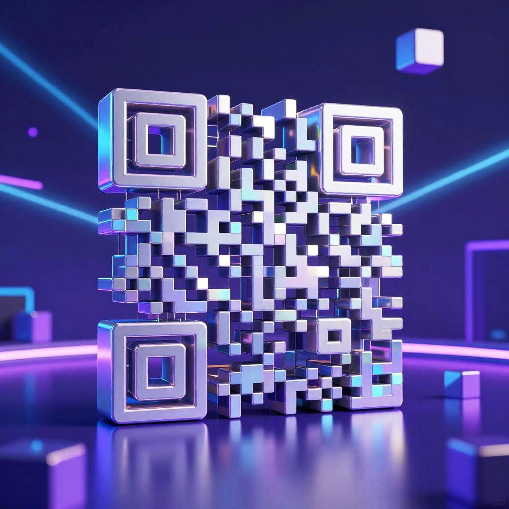 Qr art generator visualizing a 3D QR code composed of holographic cubes and light beams, immersive digital environment, cyberpunk aesthetics and neon purple-blue palette