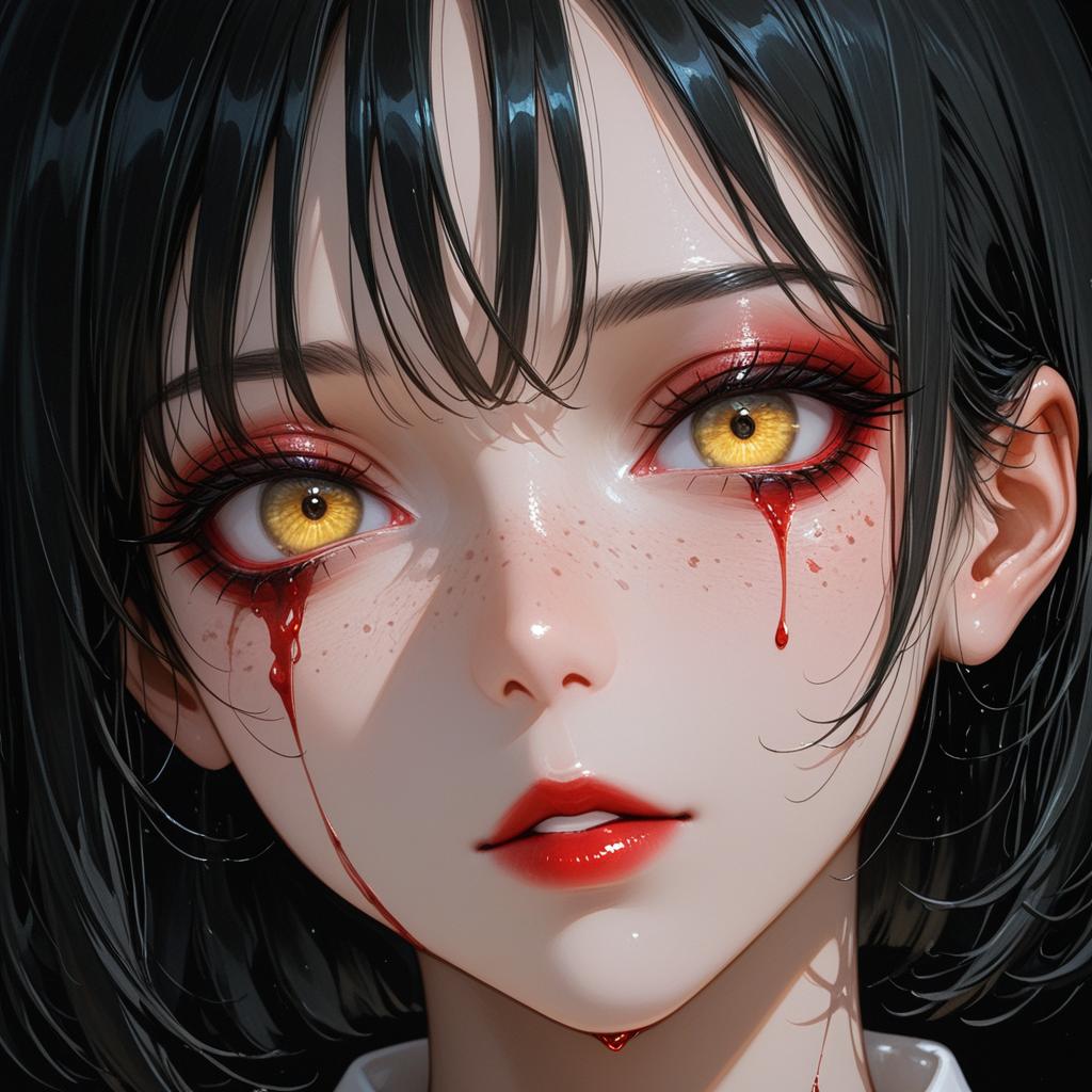 Solo, 1girl, red lips, makeup, blood, looking at viewer, yellow eyes, blood on face, eyeshadow, portrait, lipstick, crack, traditional media, lips, eyelashes, black background, black hair, eyeliner, close-up, freckles, mascara, blood from eyes, painting (medium), parted lips, runny makeup