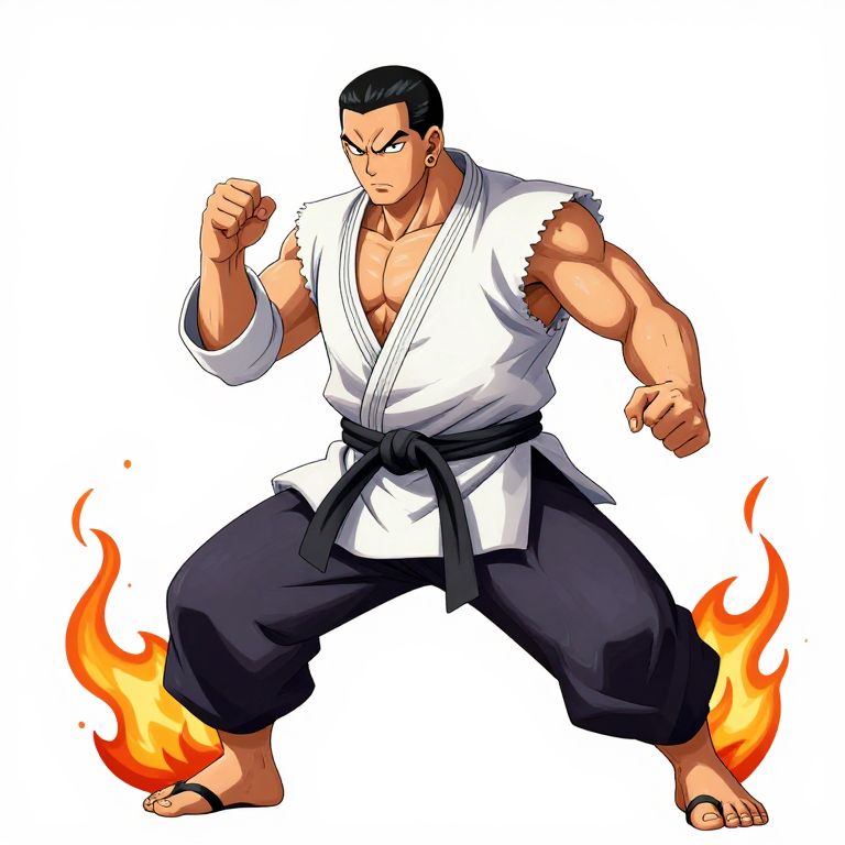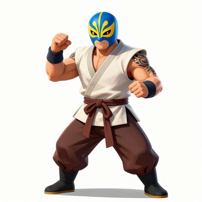A muscular character with a blue and yellow mask and tattooed arms, dressed in a traditional martial arts outfit, stands in a fighting stance.