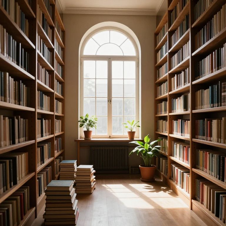 Photograph of a sunlit library aisle featuring tall, dark wooden bookshelves on both sides filled with books of varying sizes and colors. Stacks of books are neatly arranged on the polished wooden floor in the center. At the end of the aisle is an arched, white-framed window allowing bright sunlight to flood in, illuminating two potted green plants placed on the windowsill and the floor. The walls are a soft beige, and the overall atmosphere is warm and inviting.