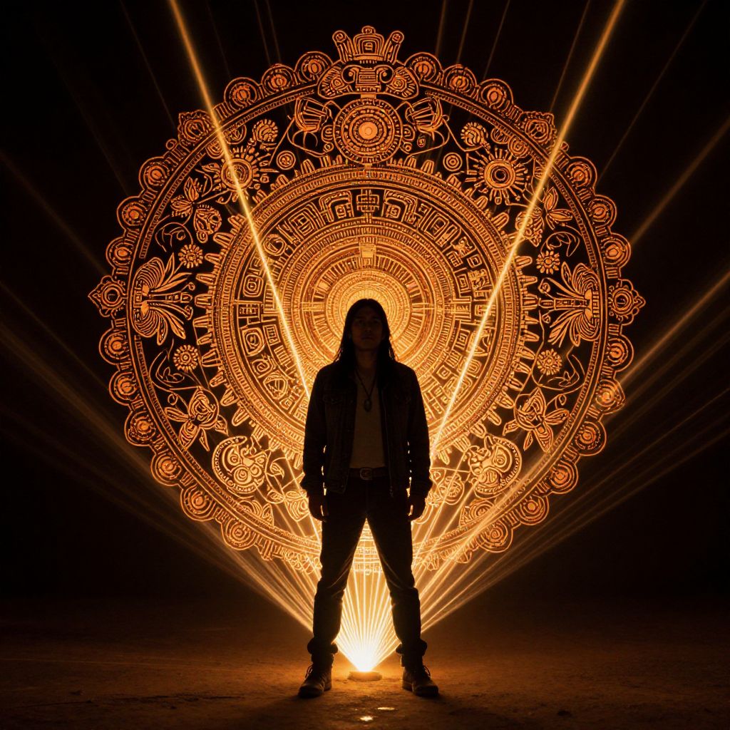 A chicano, an indigenous young man with long hair is standing in a cone of laserlight. dramatic laser lighting, intricate detailed, alchemy, anime, mesoamerican, photograph, haute couture, symbolism, science fiction art, surreal object photography, alebrijes, strong silhouette, fantasy, intrica