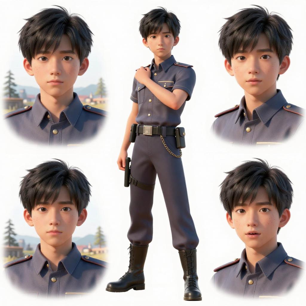 (masterpiece:1.2), (best quality), (ultra detailed), (8k, 4k, intricate), (full-body-shot:1), (highly detailed:1.2), (detailed face:1.2), (detailed background), detailed landscape, (dynamic angle:1.2), (dynamic pose:1.2), simple background, ((multiple views)), (reference sheet, white background, looking at viewer, open mouth, black hair, short hair, male, ((1boy)), full body, male focus, boots, pants, uniform