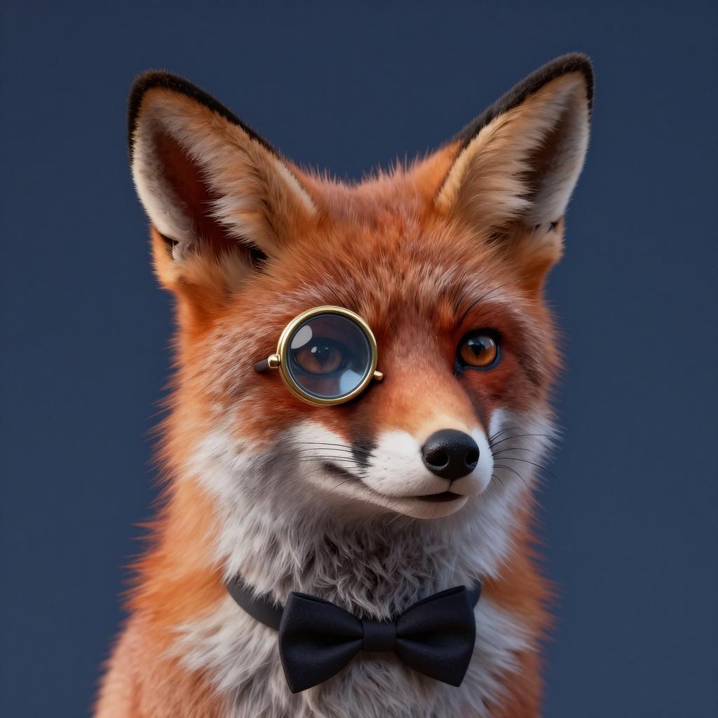 Gradient elegant fox wearing a vintage monocle and bow tie portrait, deep blue smooth gradient, character close-up portrait by Annie Leibovitz, ultra high detail, NVIDIA Iray render, ultra high definition, ArtStation quality, smooth, sharp focus, Photorealism, depth of field, 3D super resolution, octane render, award-winning photo