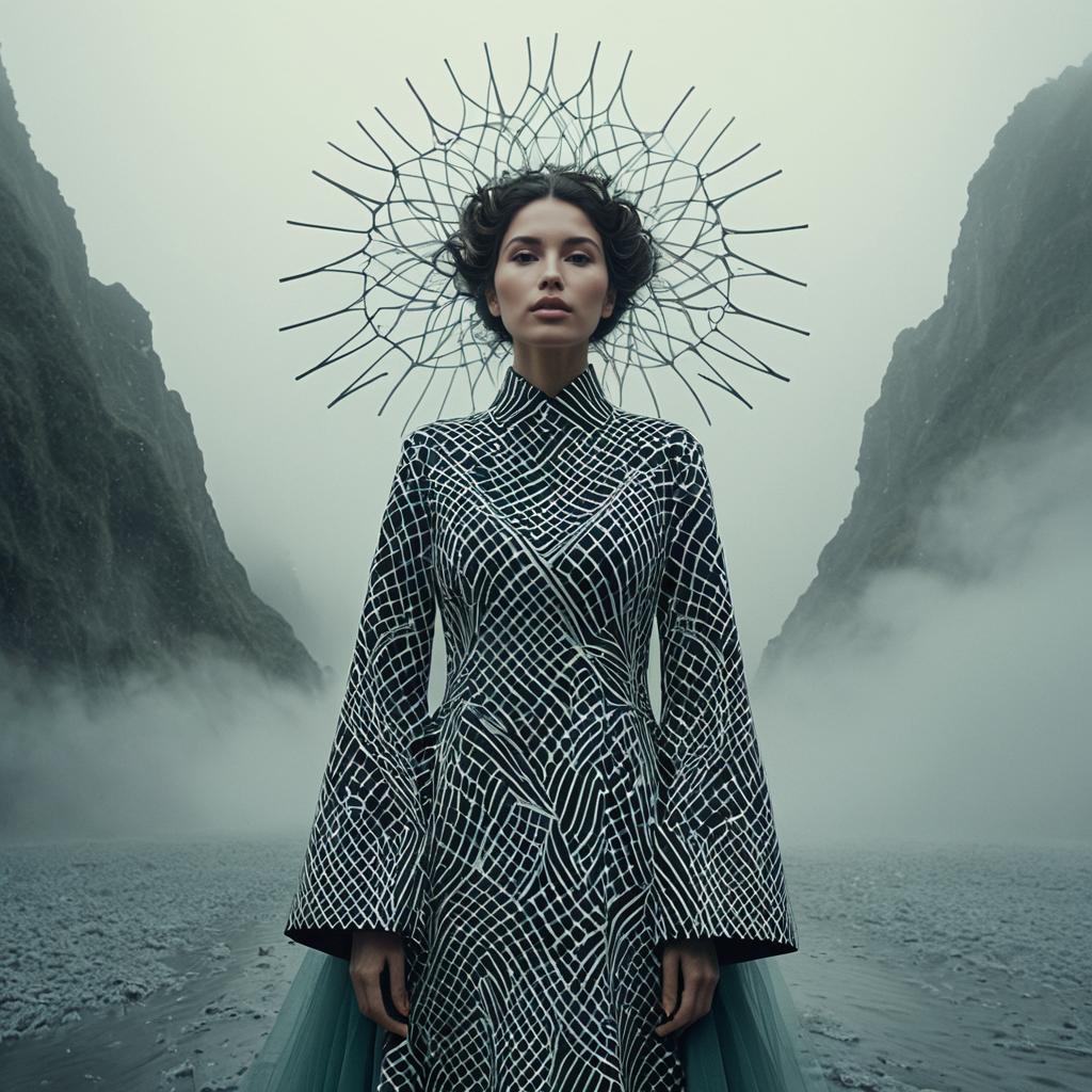 3D animation of optical art, featuring biomimetic art fashionscapes with high chaos. Art topography, hyperrealistic cinematic lighting, fog and mist. Inspired by photography of Andreas Gursky, painting styles of Bridget Riley and Victor Vasarely, dynamic fashion photography