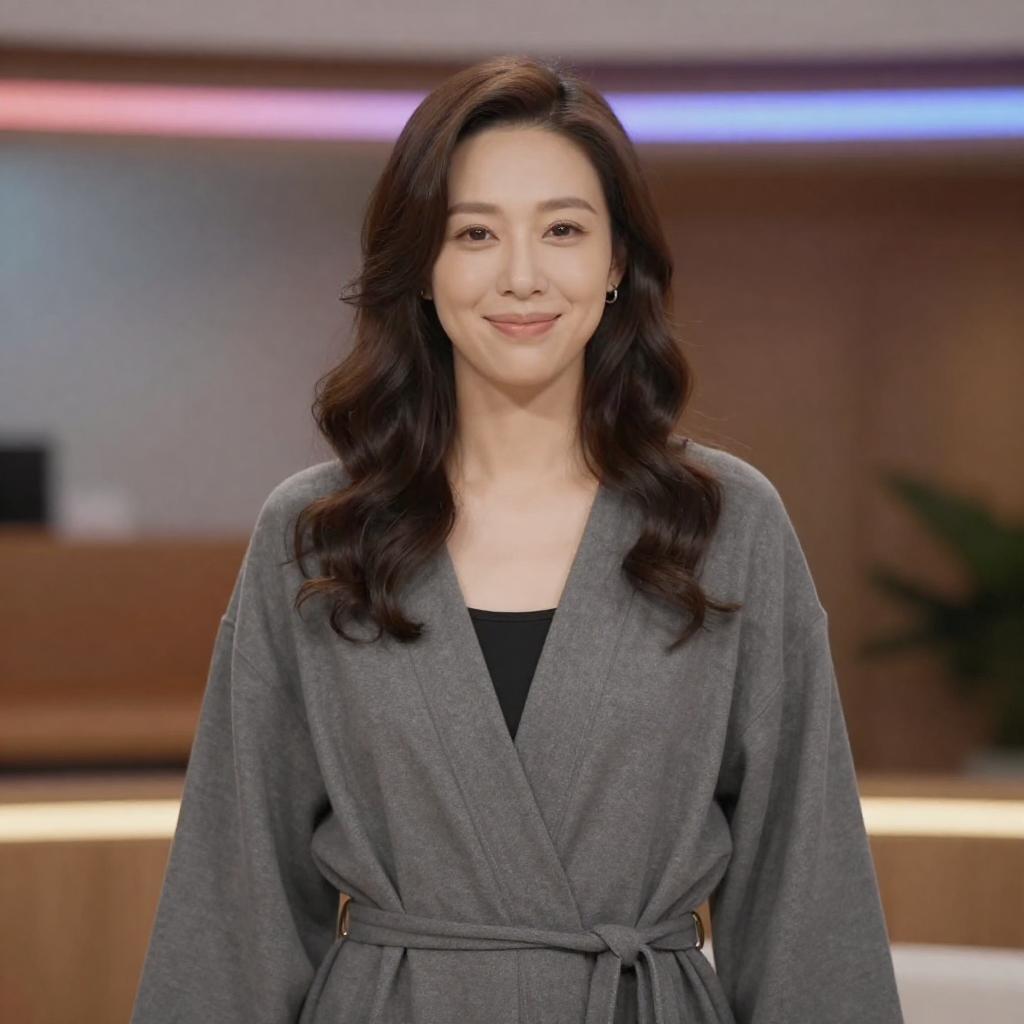 Photograph of a woman with short dark hair, fair skin, and red lipstick, wearing a dark blue coat with red lining, black polka-dot tie, and black pants. She sits on a blue couch with her hands clasped. Dark background. Car wheel partially visible on right.
