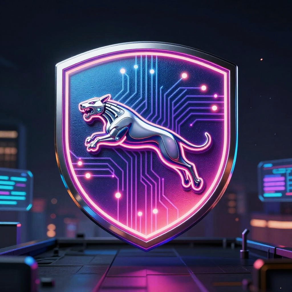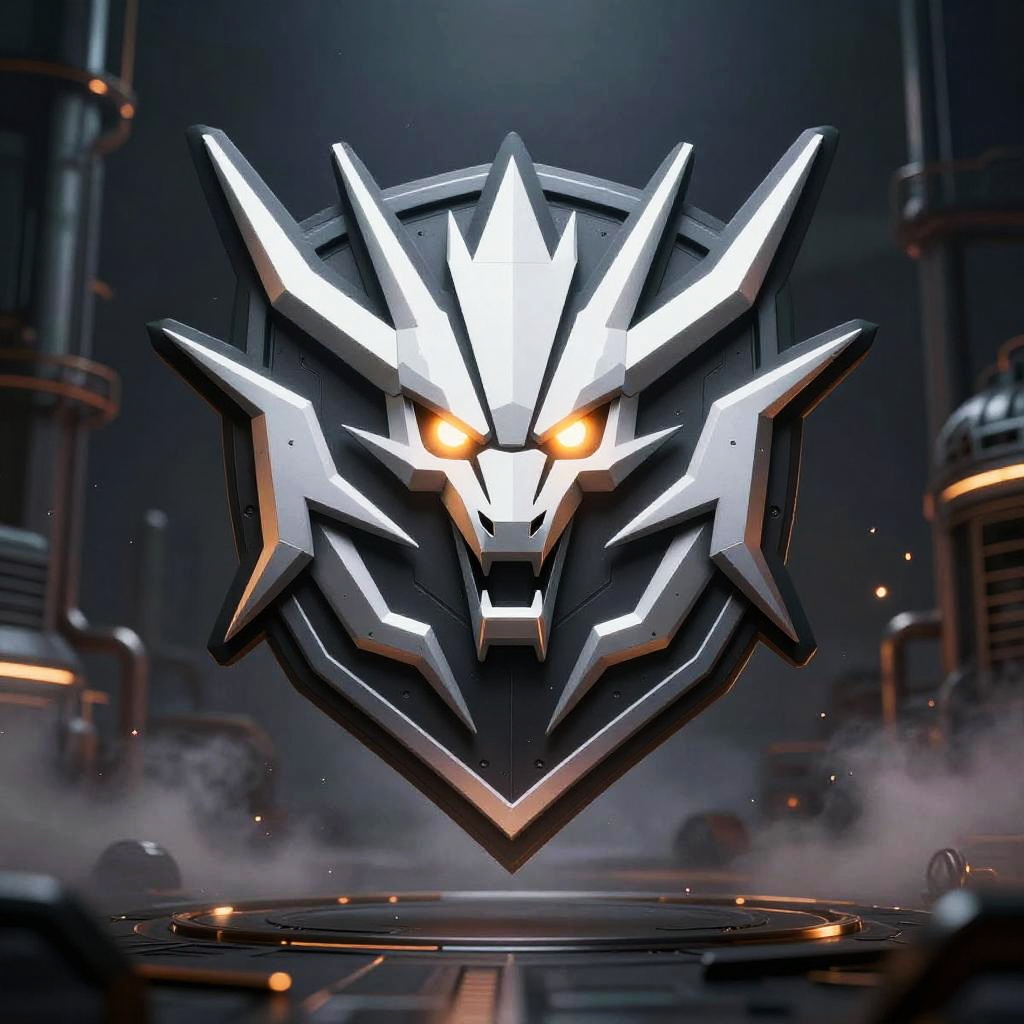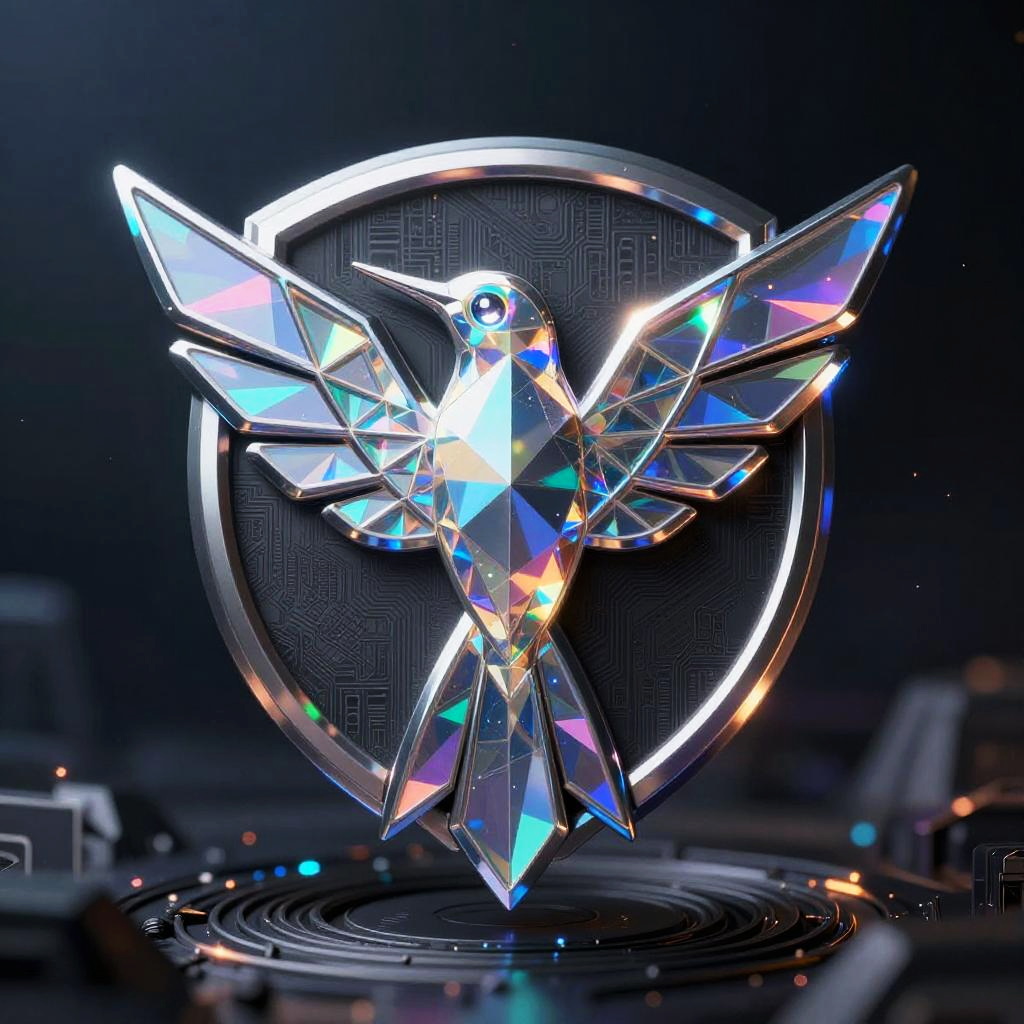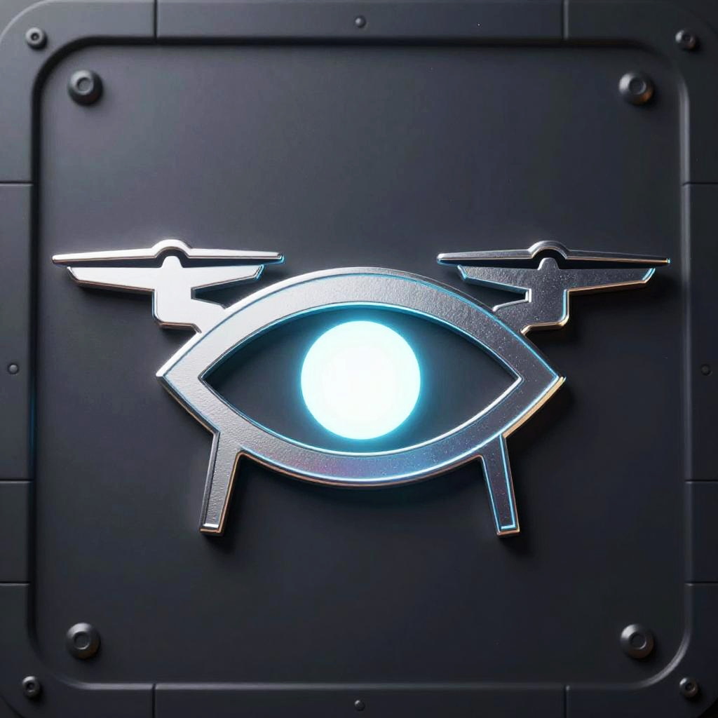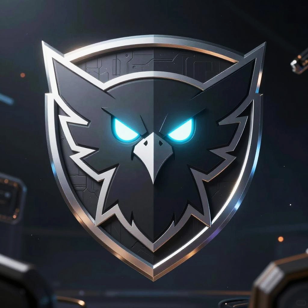 Triangular alien eye emblem, glowing hologram minimalism, emissive eyes with bioluminescent glow, high-tech microtexture and crisp vector silhouette, floating over black and purple digital ambient space, centered badge composition for esports/tech branding, glossy chrome edges, dramatic rim lighting, high contrast on charcoal, vibrant color pops, subtle film grain and bokeh sparks, raytraced reflections, clean negative space, premium and authoritative, ultra-detailed yet readable at small sizes, print-ready, 8k render