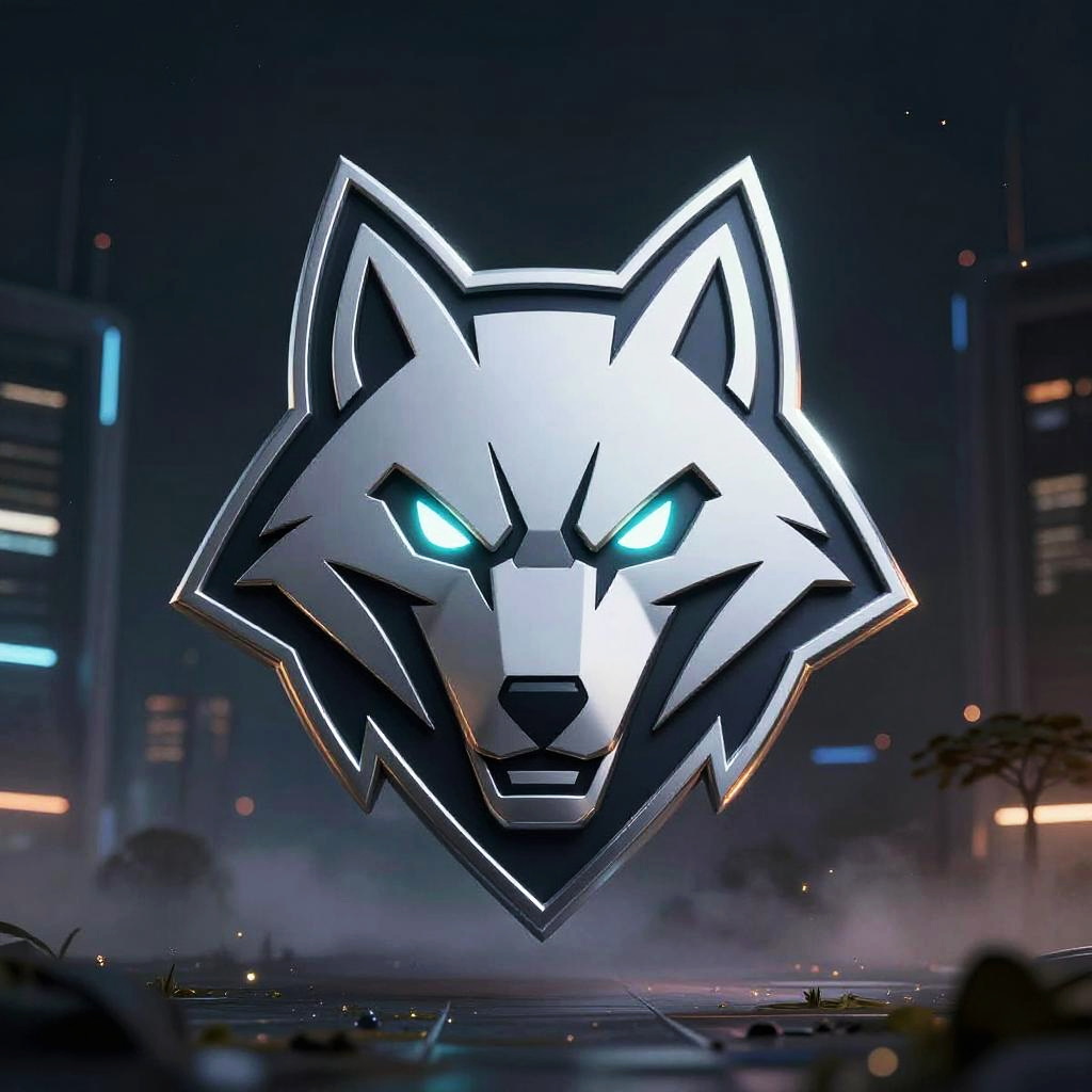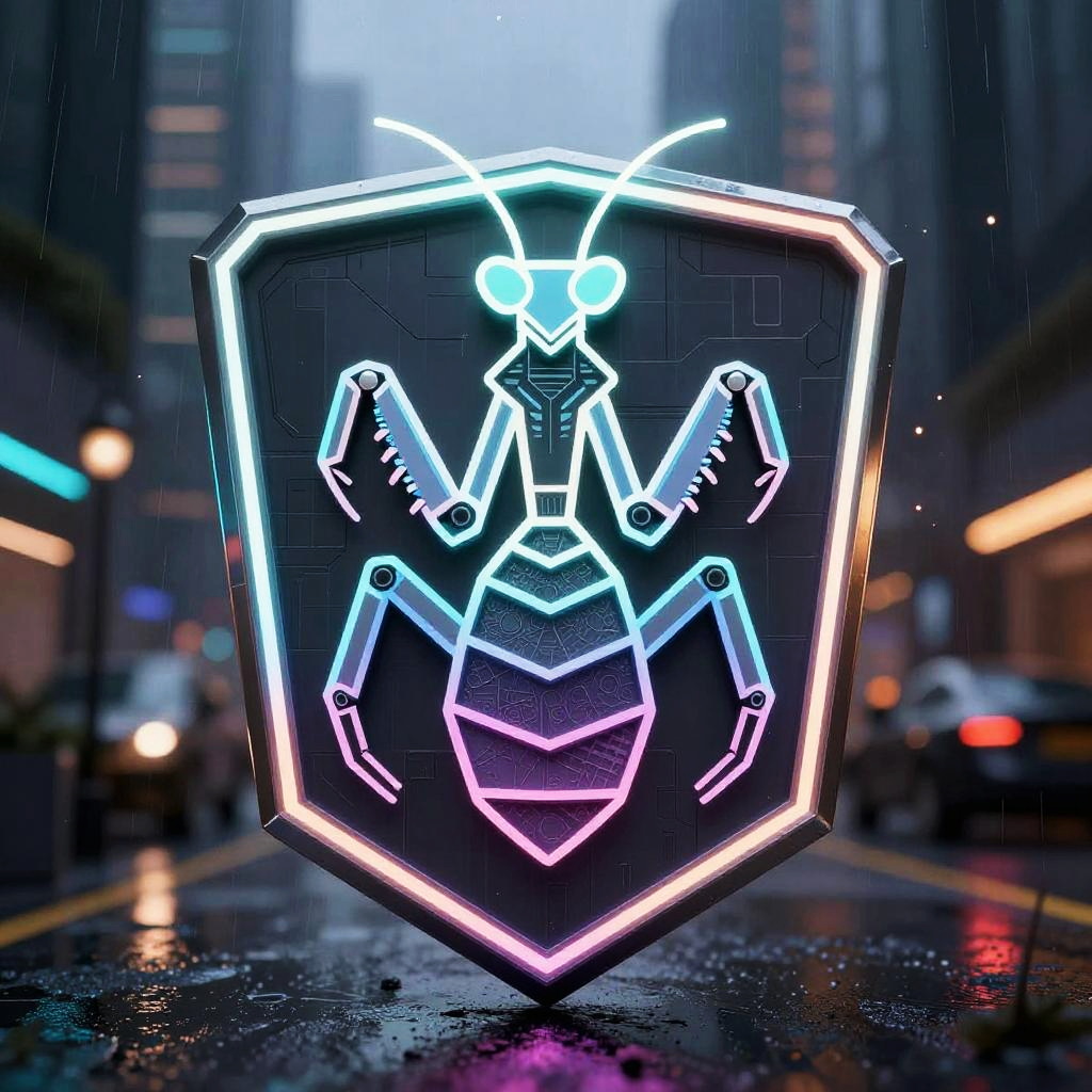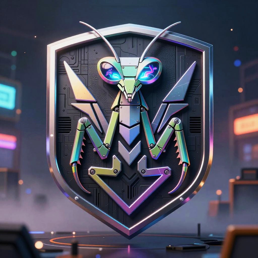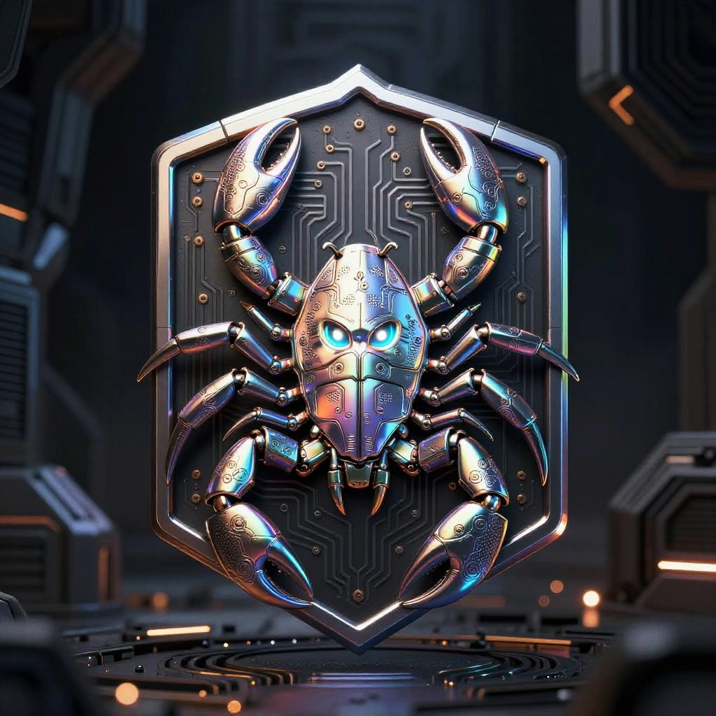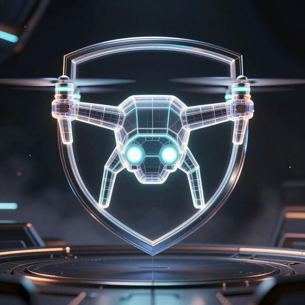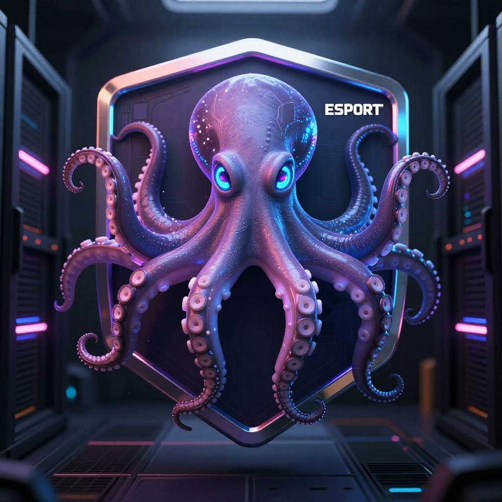 Triangular alien eye emblem, glowing hologram minimalism, emissive eyes with bioluminescent glow, high-tech microtexture and crisp vector silhouette, floating over black and purple digital ambient space, centered badge composition for esports/tech branding, glossy chrome edges, dramatic rim lighting, high contrast on charcoal, vibrant color pops, subtle film grain and bokeh sparks, raytraced reflections, clean negative space, premium and authoritative, ultra-detailed yet readable at small sizes, print-ready, 8k render