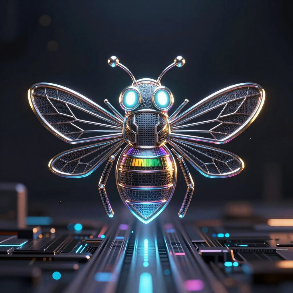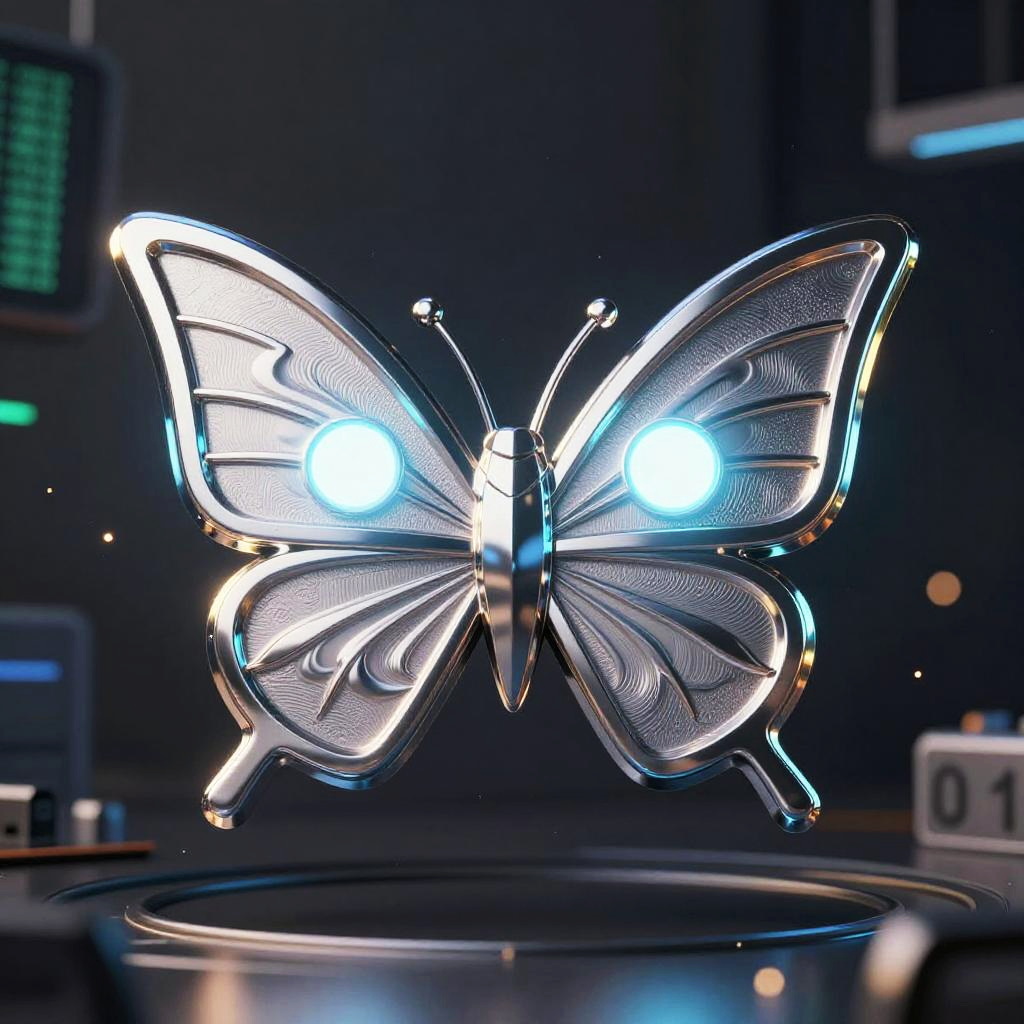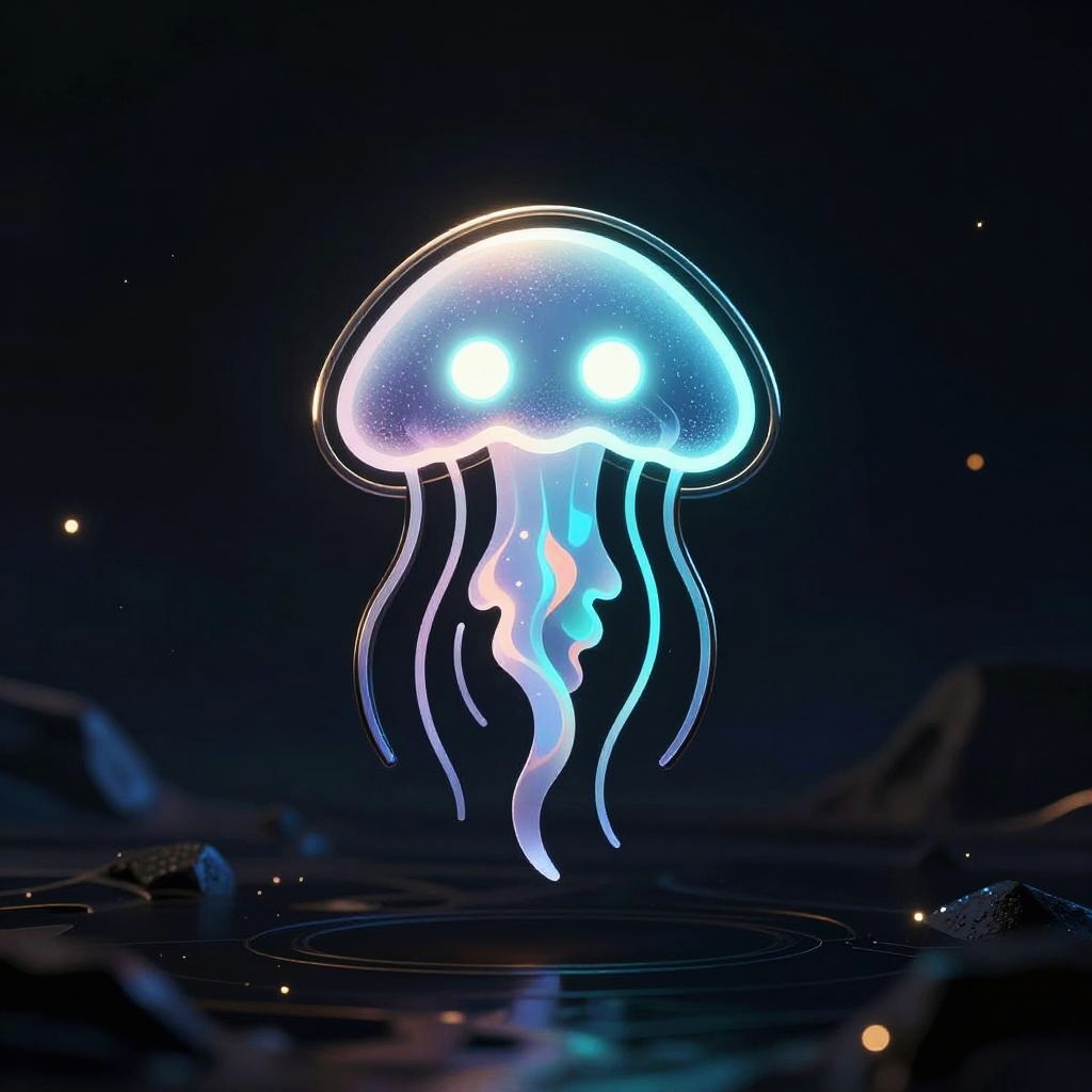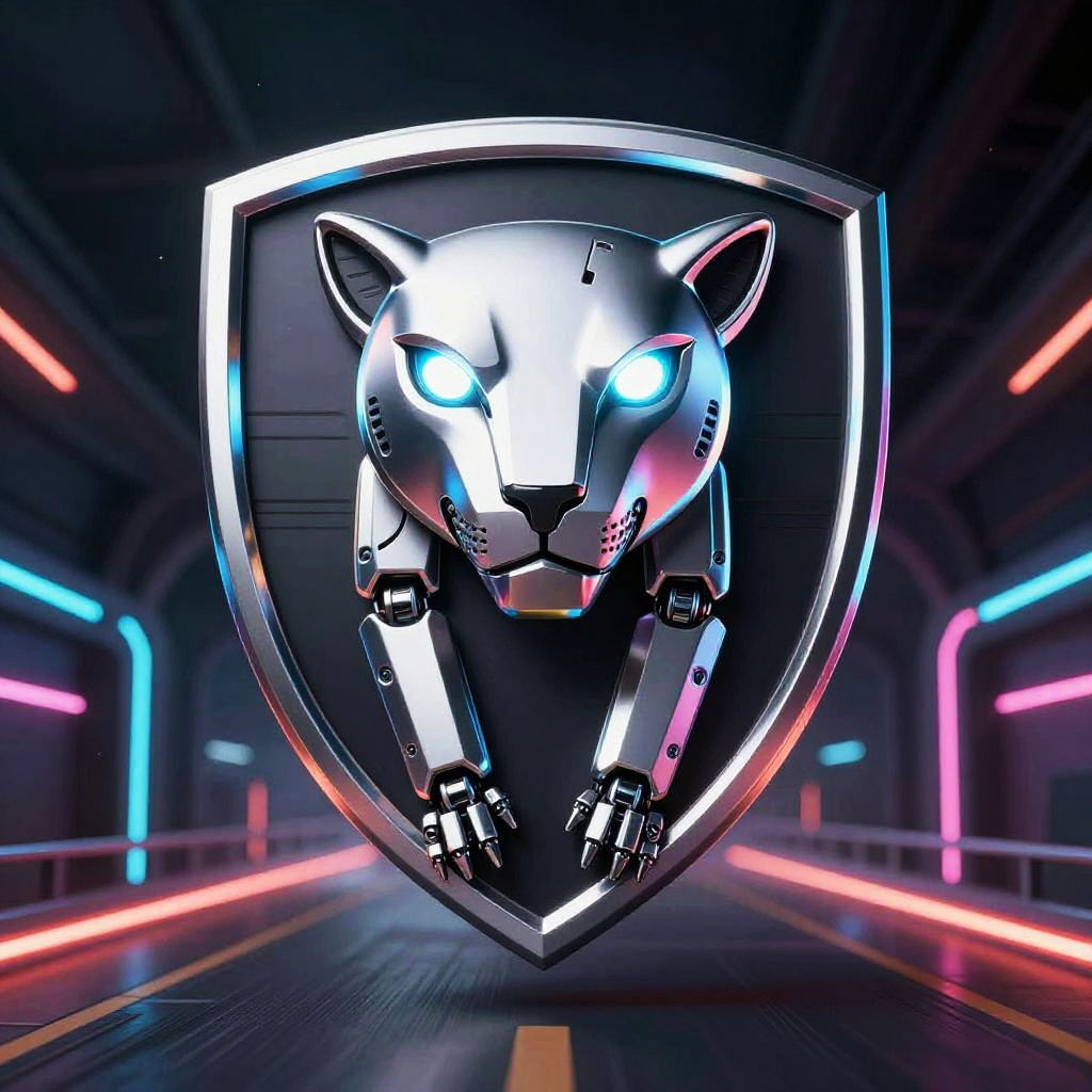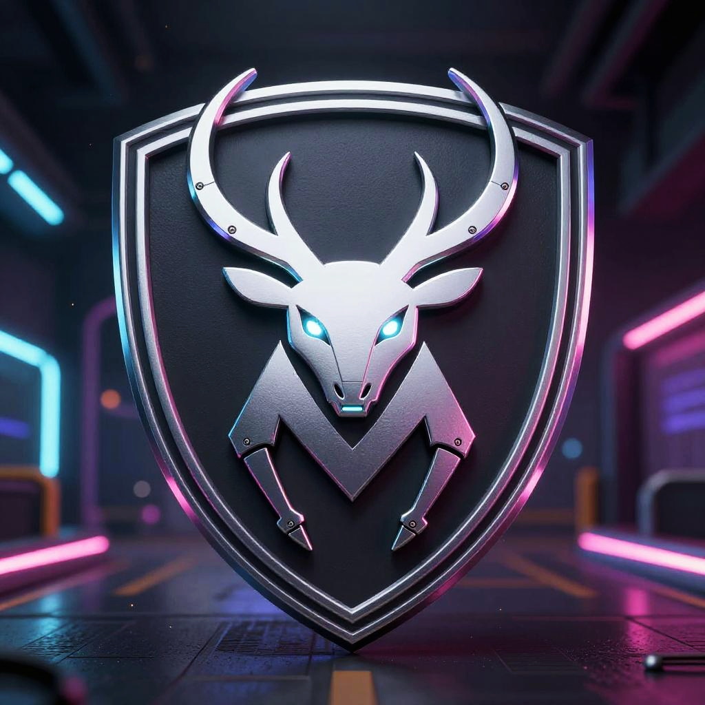 Triangular alien eye emblem, glowing hologram minimalism, emissive eyes with bioluminescent glow, high-tech microtexture and crisp vector silhouette, floating over black and purple digital ambient space, centered badge composition for esports/tech branding, glossy chrome edges, dramatic rim lighting, high contrast on charcoal, vibrant color pops, subtle film grain and bokeh sparks, raytraced reflections, clean negative space, premium and authoritative, ultra-detailed yet readable at small sizes, print-ready, 8k render