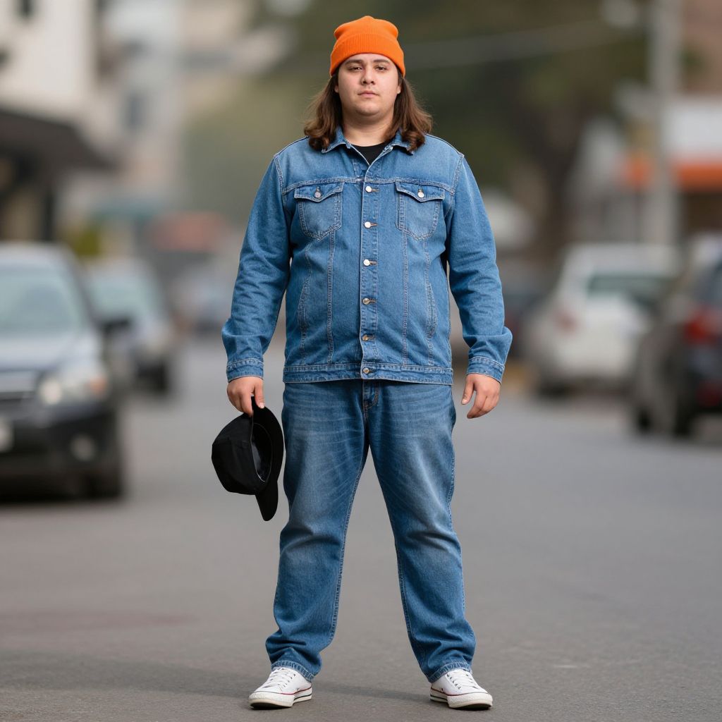 Plus size construction, denim, 1boy, male focus, solo, hat, pants, jeans, brown hair, long hair, holding, full body, long sleeves, standing, jacket, blurry background, orange headwear, looking at viewer, outdoors, blurry