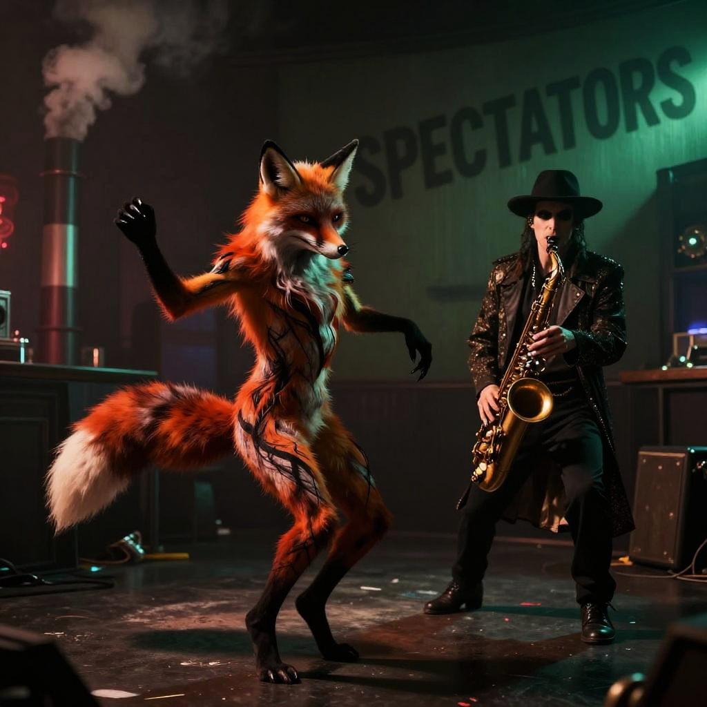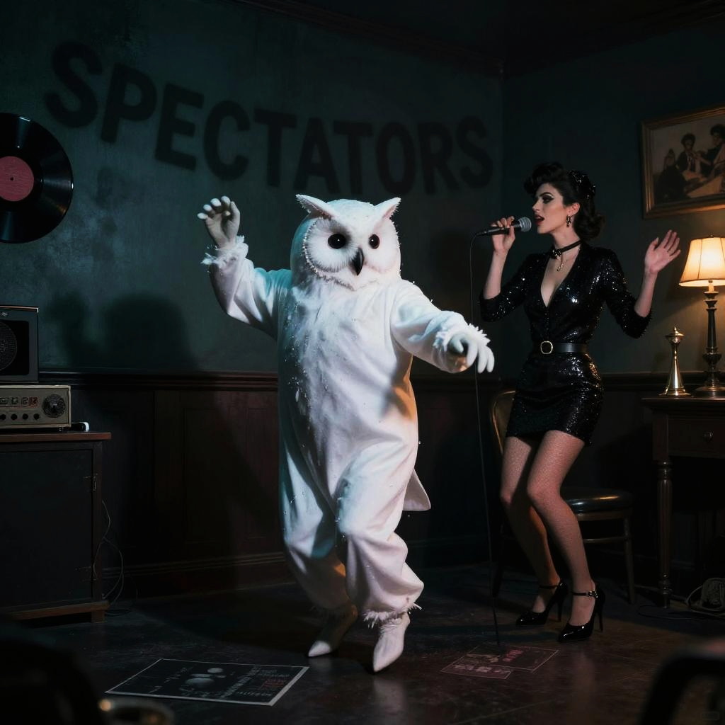A very sinister looking spooky jackal creature sharing an acid trip vibe, dancing with a beatnik‑looking retro beatnik girl, in a dark psychedelic noir scene. The room is very dimly lit, with a partial view of a faded concert poster against the back wall. The dim lighting casts a shadow spelling 'SPECTATORS'.