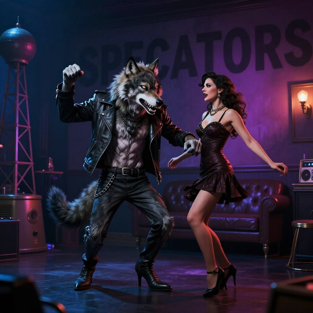 A sinister, spooky jackal creature with fur and a leather jacket dances with a retro beatnik woman wearing a black leather dress and high heels. The dimly lit, psychedelic noir room features dark leather couches and a faded concert poster with the word 'SPECTATORS' on the background wall.