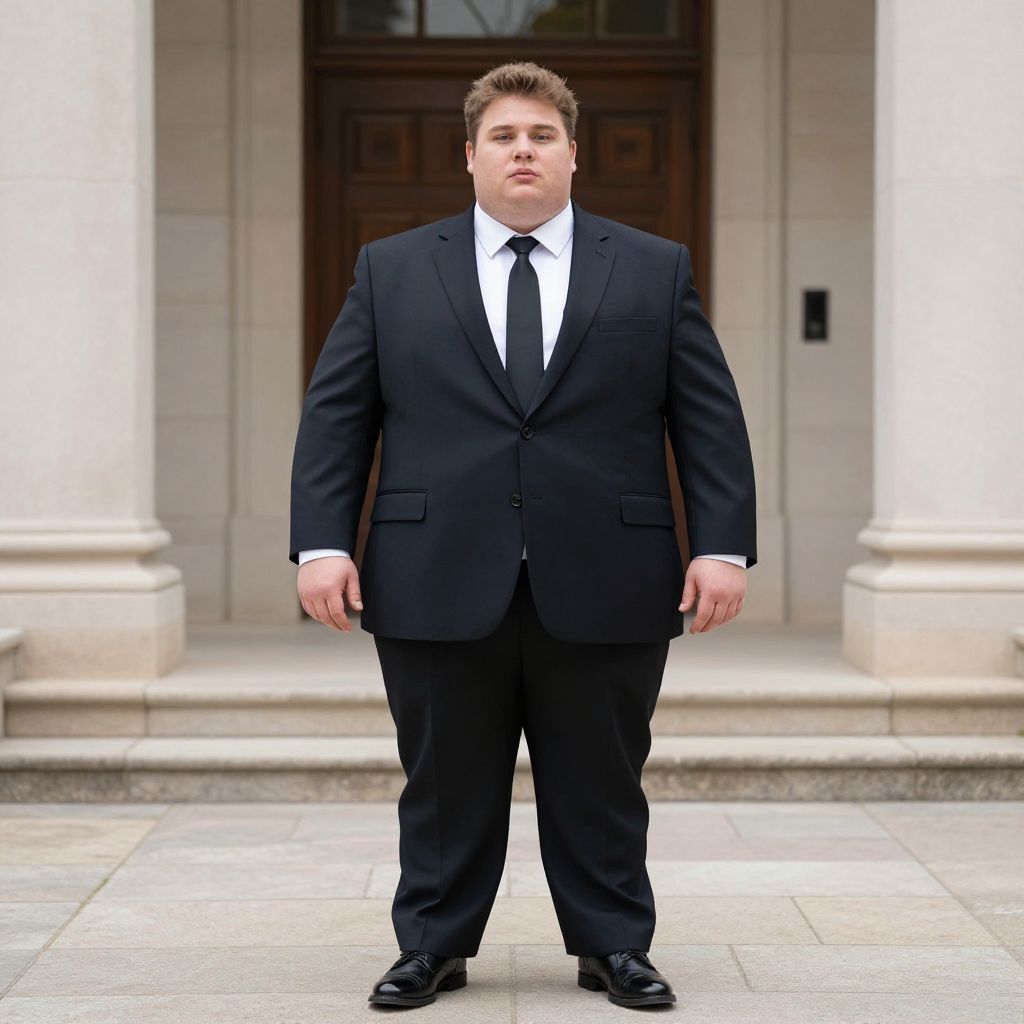 Photograph of a heavyset man standing in front of a building with white columns and a dark wooden door. He has short brown hair, a fair skin tone, and is wearing a black suit with a white shirt and black tie. His expression is neutral, and he stands with his hands by his sides. The ground is paved with light gray tiles. The image has a sharp focus on the man, with the background slightly blurred. The overall style is realistic and formal.