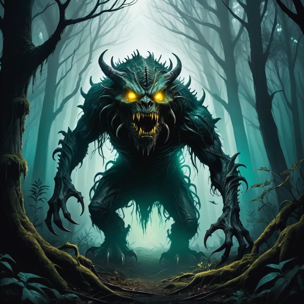 A creepy dark fantasy monster with glowing yellow eyes and sharp teeth lurking in a gloomy forest at night, surrounded by tall eerie trees and dense underbrush, moody teal and green lighting casting harsh shadows, spooky horror atmosphere