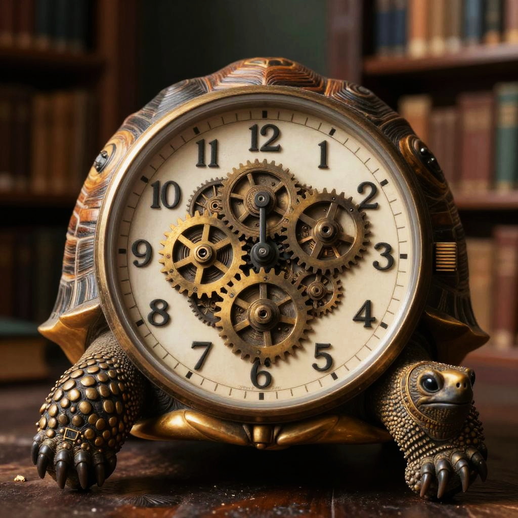 An imaginative hybrid of a tortoise and a watch face, featuring shell engraved with ticking gears, set against an ancient library.