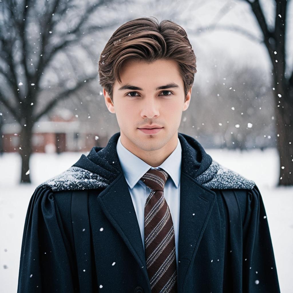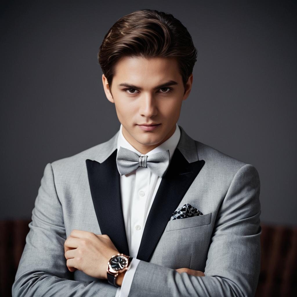 Man christmas party outfit,1boy, male focus, solo, suspenders, christmas tree, realistic, watch, bow, wristwatch, christmas, bowtie, hand in pocket, gift, vest