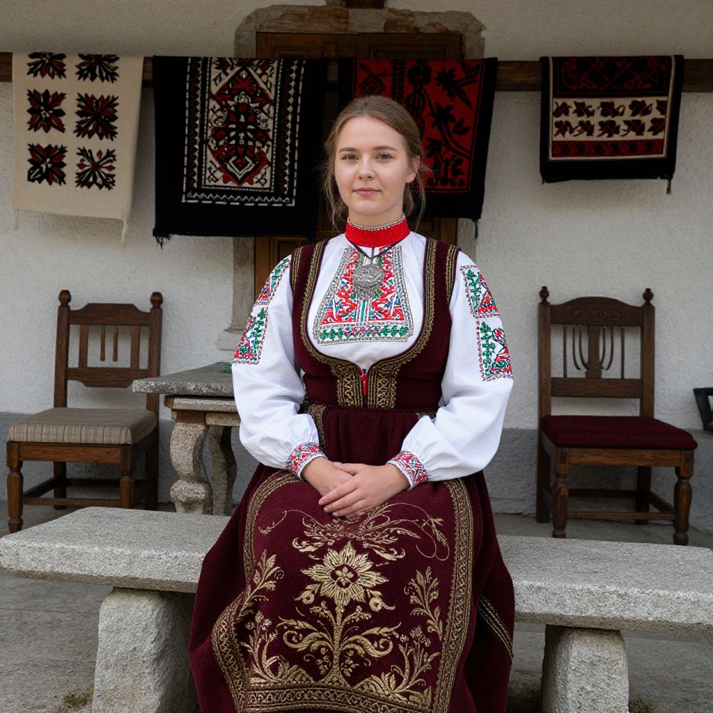 A woman in a detailed Slovenian folk costume seated on a stone bench in a mountain village courtyard, wearing a long, hand-embroidered dress in burgundy and white, with gold thread patterns, a red blouse with a high collar, and a traditional silver pendant at her neck, her face has soft features with a slightly upturned nose and soft, serene expression, surrounded by vintage wooden furniture and hanging embroidered textiles. The woman has big tits and cute face