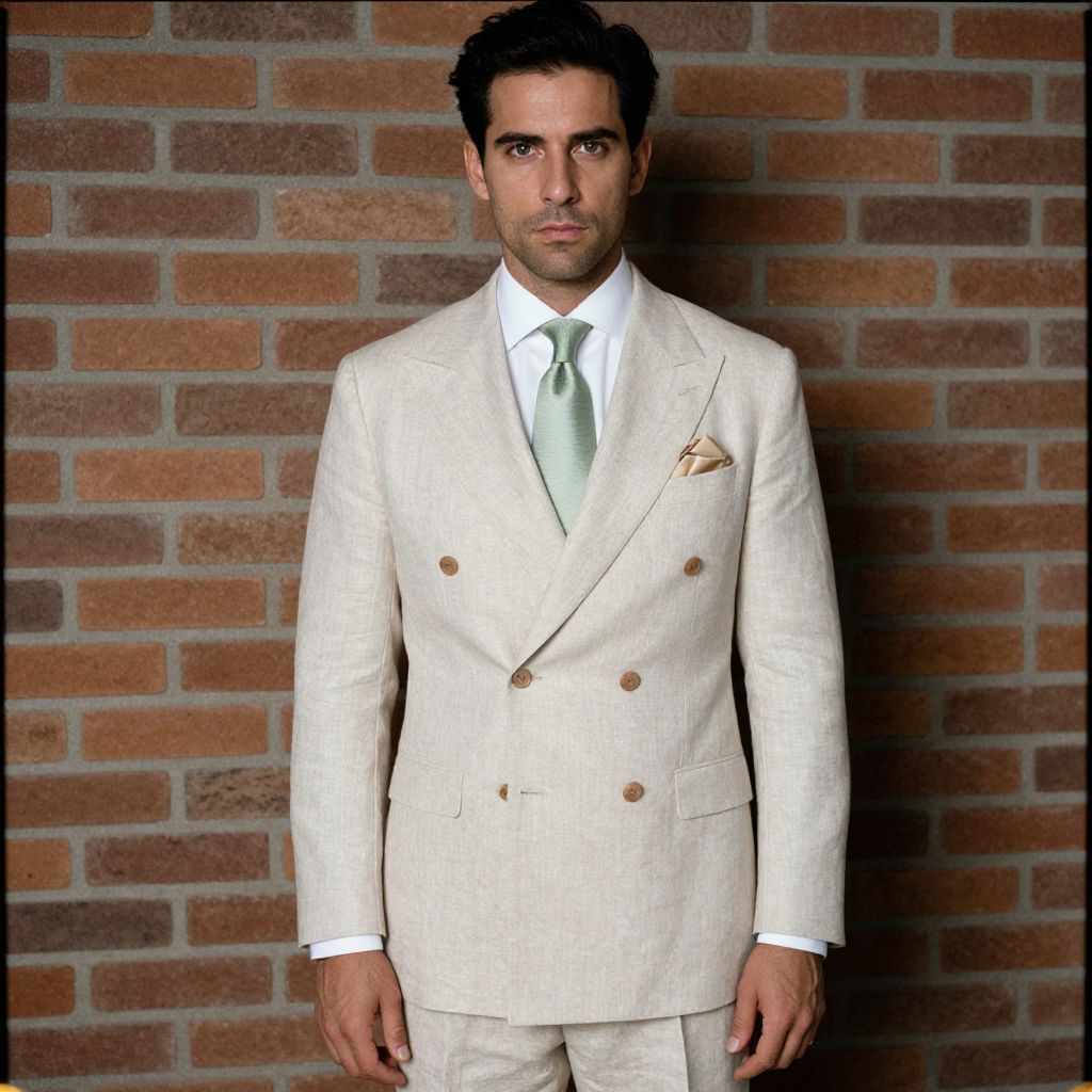 A man, light beige linen double-breasted suit, white cotton dress shirt, pastel green silk tie, tan leather loafers, coordinating beige pocket square, rustic brick walls, cri film style, confident expression Man has masculine face and piercing eyes