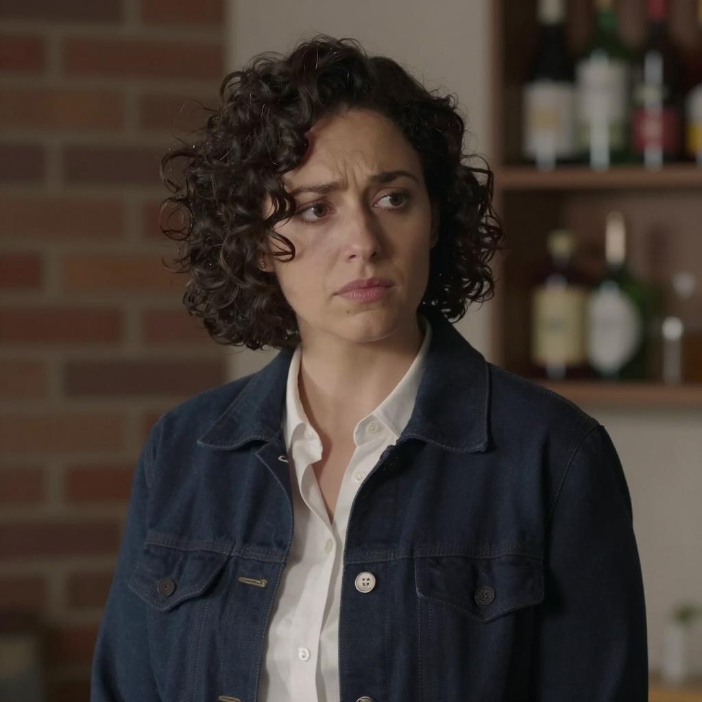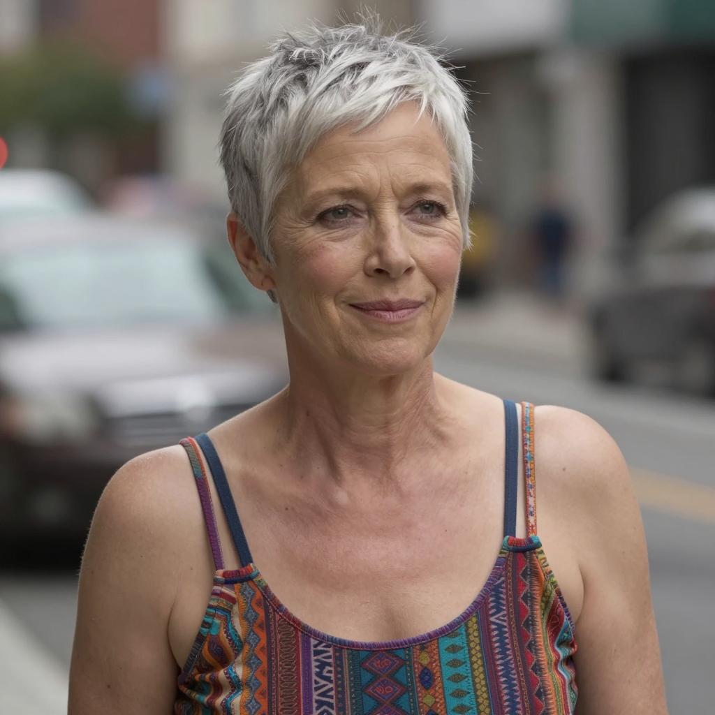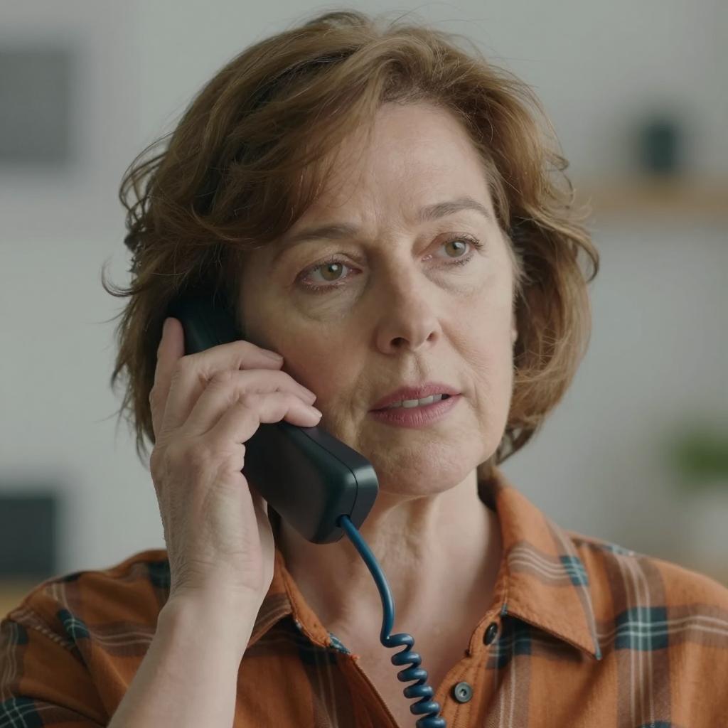 A close-up photograph of a middle-aged woman with short, wavy, light brown hair. She is holding a black corded telephone to her right ear with her right hand. She wears an orange plaid shirt. Her mouth is slightly open, and her eyes are focused ahead. The background is blurred and grey, with indistinct shapes. The telephone cord is blue and metallic.