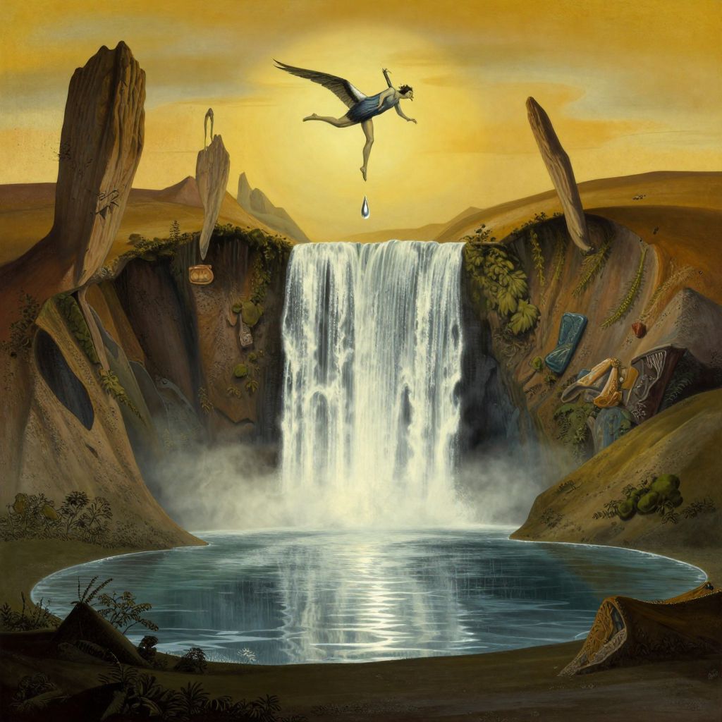 An enchanting surrealist landscape showcases a distorted reality where gravity seems to bend and twist, reminiscent of Dali's iconic visions. A majestic waterfall flows into a pool with a shimmering surface resembling liquid mercury, reflecting the surrounding mountains that appear elongated and warped in this dreamlike space. Perched atop a falling droplet is an enigmatic figure, part human, part bird, gracefully gliding through the surreal environment as their form stretches and warps. The scene is bathed in a warm golden light from an unseen source, invoking a sense of wonder and introspection within the viewer.