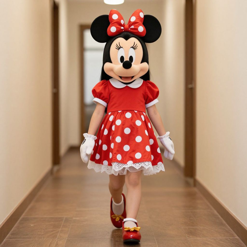 Minnie Costume Dress, dressed in a minnie mouse costume walking down a hallway