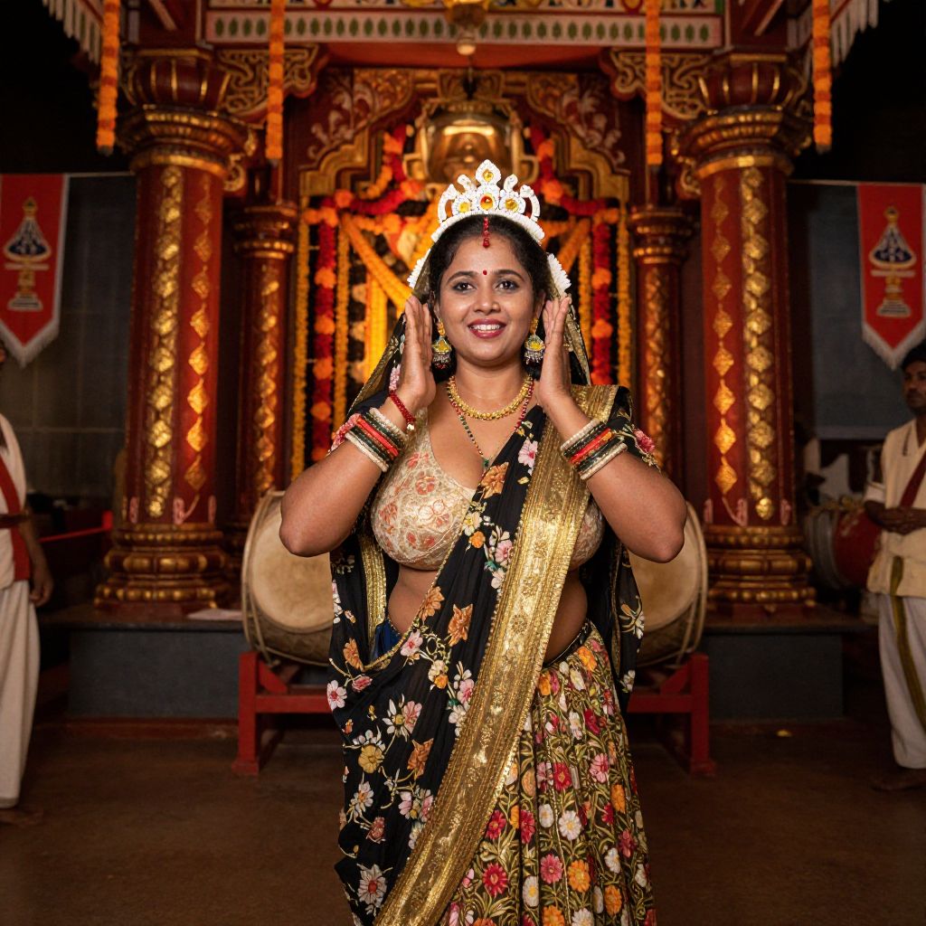 A South Indian woman dressed in a traditional Thiruvathira costume, featuring a black floral sari with a golden border and a floral printed skirt. She is standing in a richly decorated ceremonial hall with ornate red and gold pillars and festive garlands. The woman wears traditional jewelry, bangles, and a white floral headpiece, smiling with pride and joy. The background includes cultural elements like drums and banners, highlighting the festive temple atmosphere.