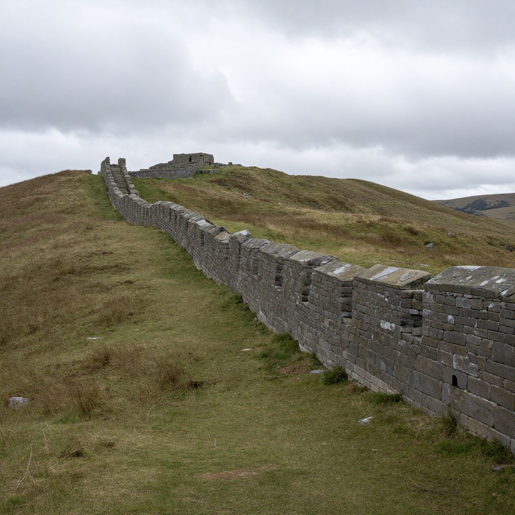 Hadrian's Wall stretching across a rugged northern English landscape under a cloudy sky, ancient Roman stone fortifications blending into rolling green hills, a sense of history and solitude, detailed textures, realistic style