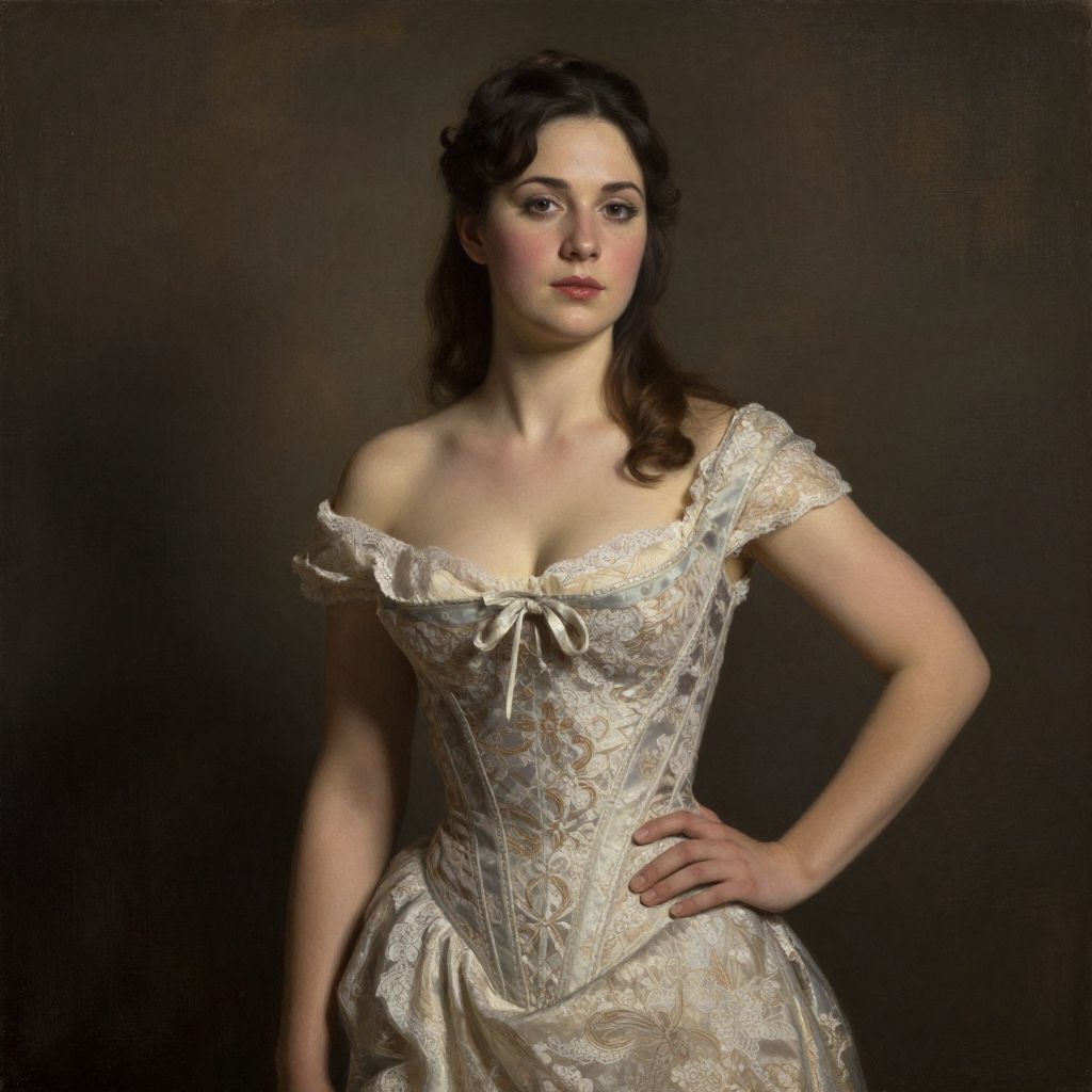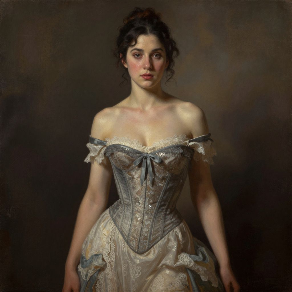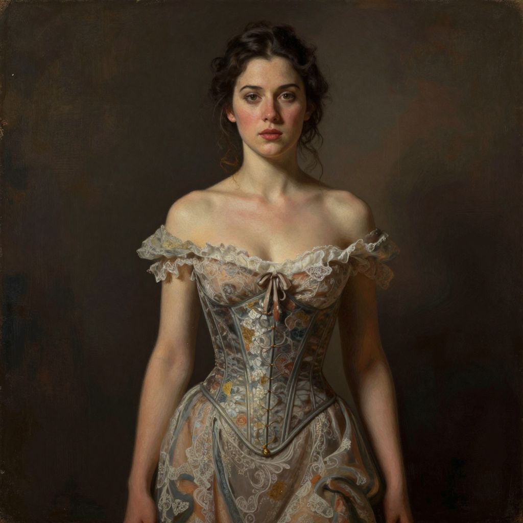 A digitally rendered portrait reminiscent of Michael Malm's American figurative style, featuring a woman in a vintage corset dress with intricate lace details, set against a moody, textured background with dramatic lighting that highlights her elegant pose and refined features.
