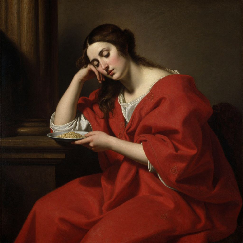 A Baroque-inspired oil painting featuring a woman draped in a vibrant red cloak, rendered with dramatic chiaroscuro lighting reminiscent of Caravaggio's style, as she sits contemplatively near a wooden column, her hands gently holding a small dish of grain.