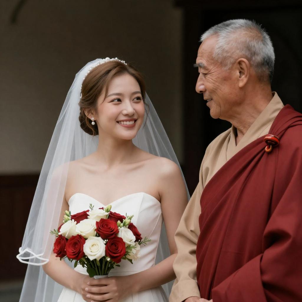 Black-and-white photograph of a wedding. A bride with a veil and floral bouquet stands beside a groom in a suit, both smiling. An older man in a tuxedo stands to the right, smiling. Background includes a wooden fence and foliage. The groom holds the bride's arm, creating a close, intimate pose.
